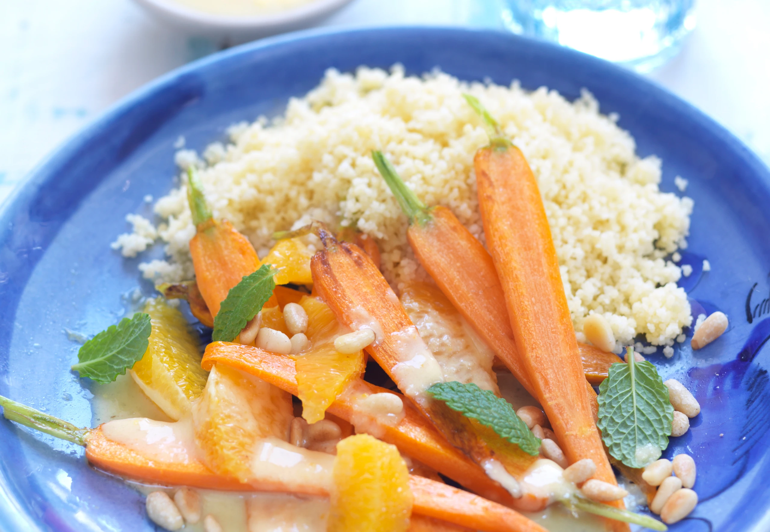 Karotten portionsweise mit Sauce, Orangenfilets und aufgefangenem Saft anrichten, mit Pignoli und Minzeblättchen bestreuen. Dazu passt Couscous.