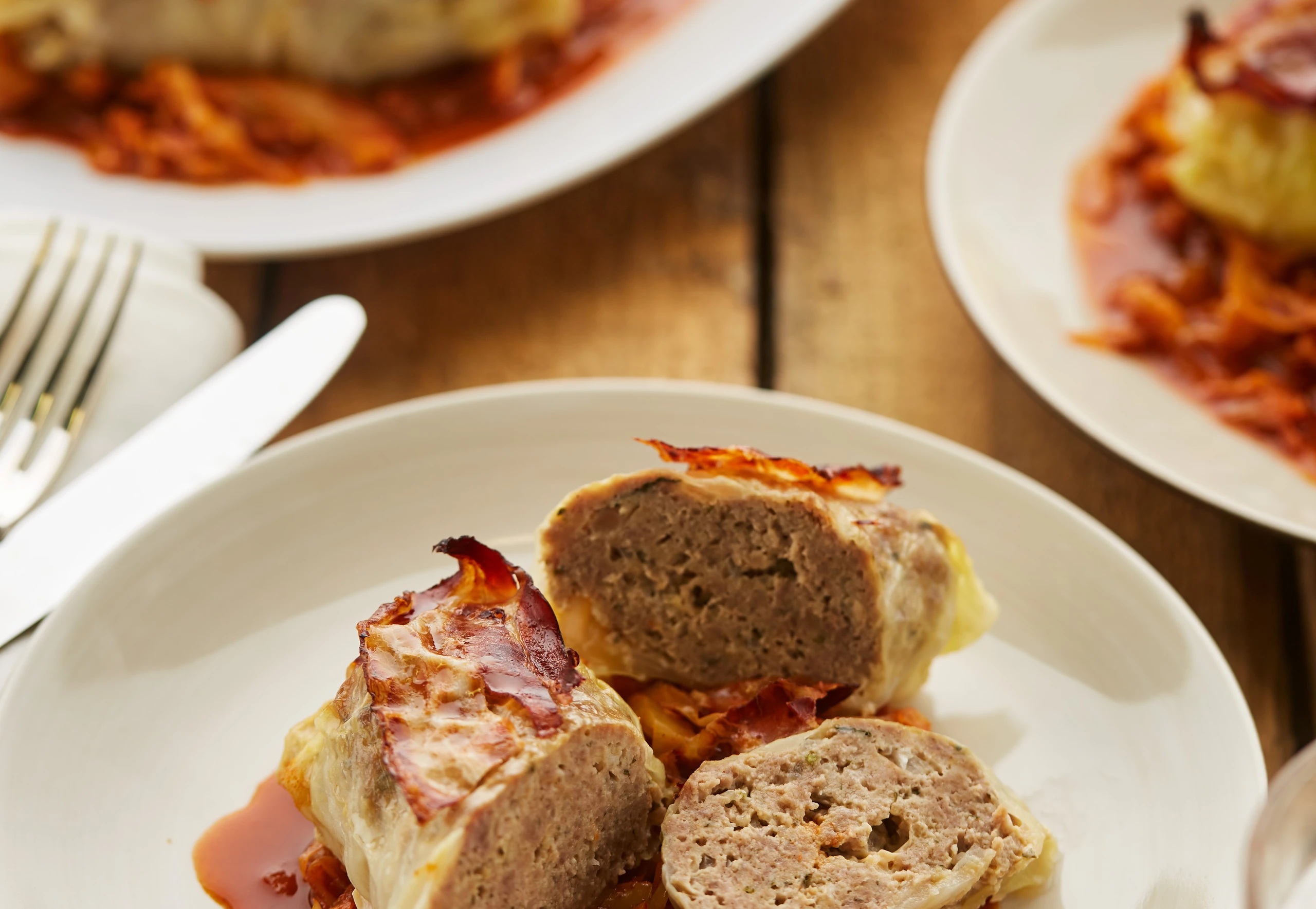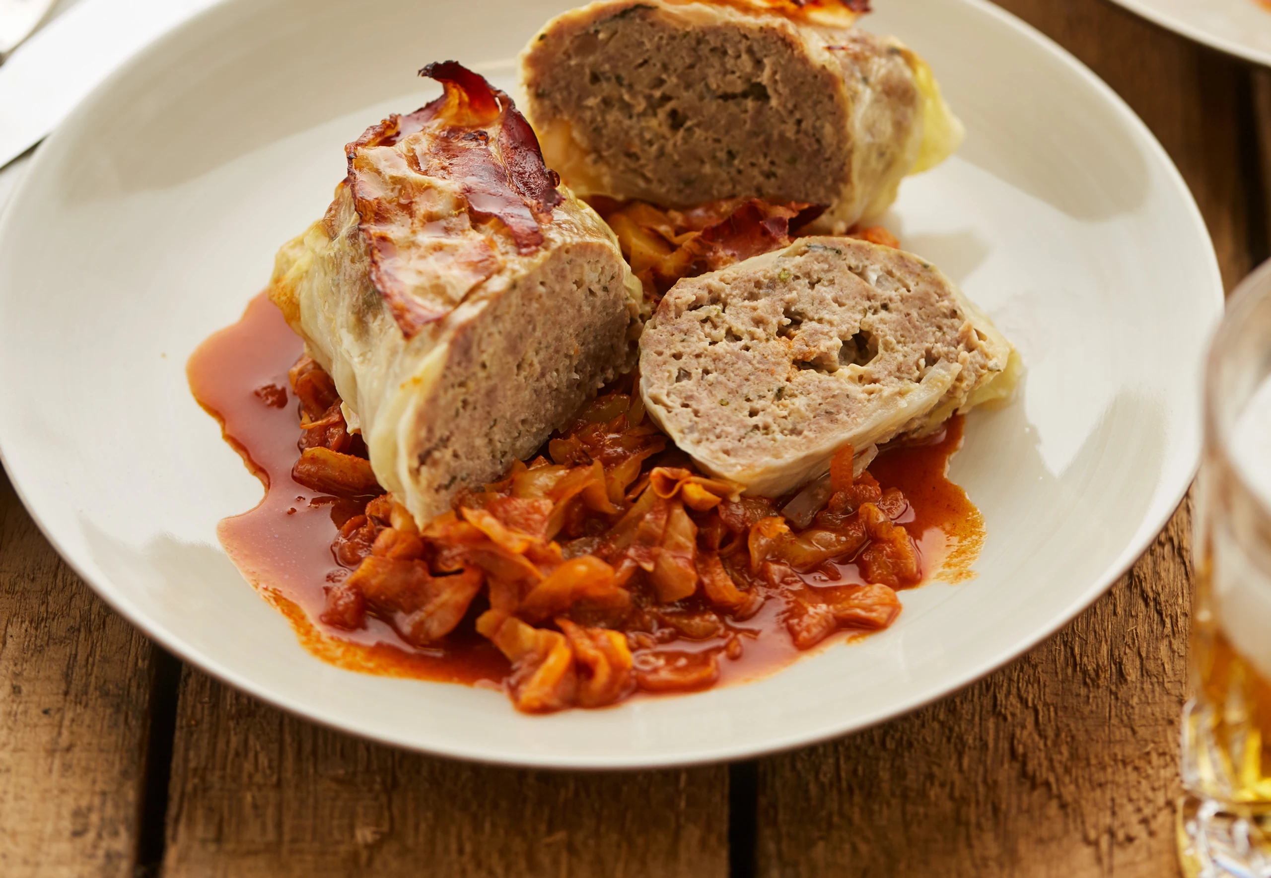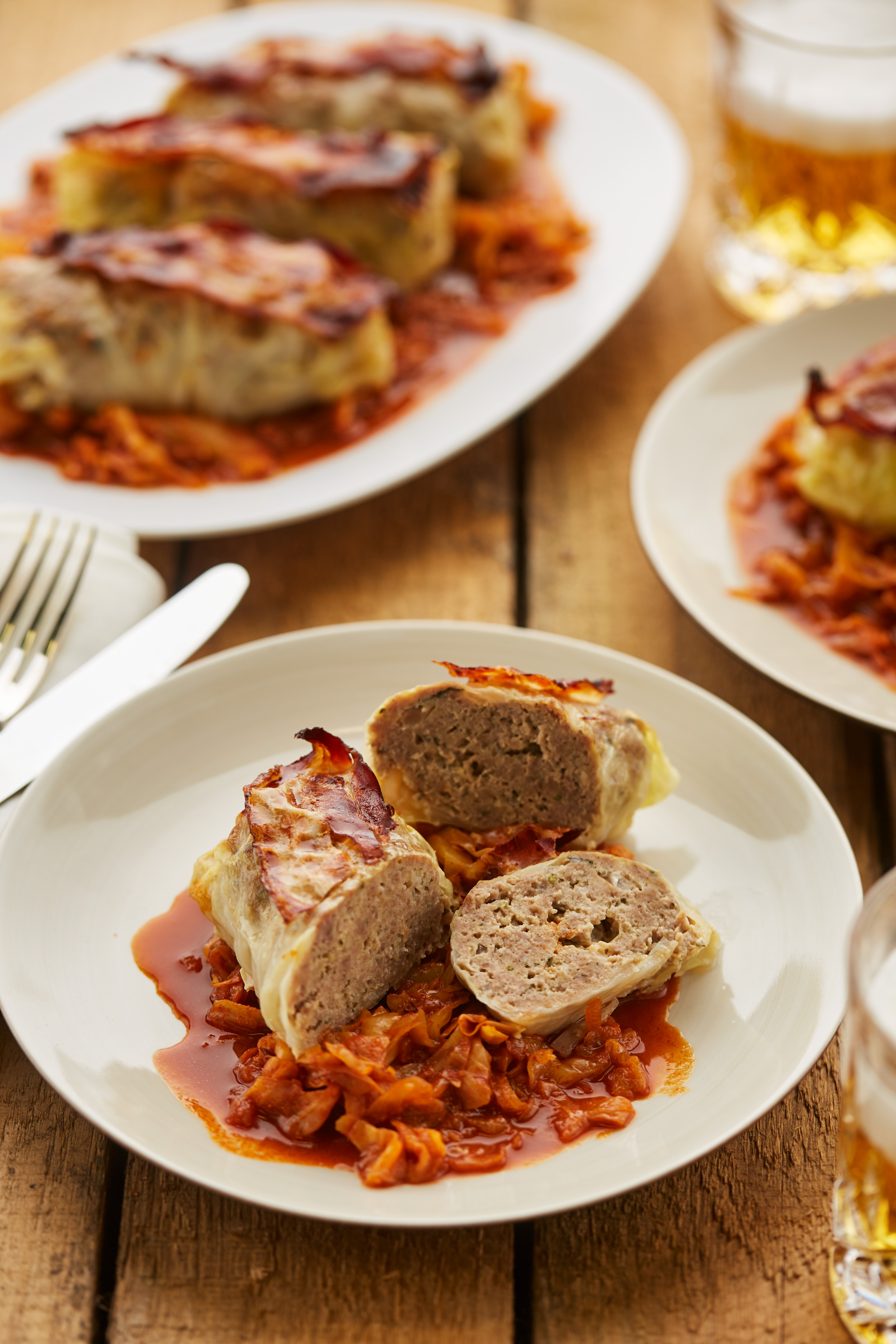 Kraut rund um den Strunk einschneiden, ca. 3 Minuten in Salzwasser kochen und kalt abschrecken. 8 Krautblätter ablösen und nochmals in Salzwasser weich kochen (ca. 3 Minuten). Herausheben, kalt abschrecken und auflegen. Dicke Mittelrippen ausschneiden.