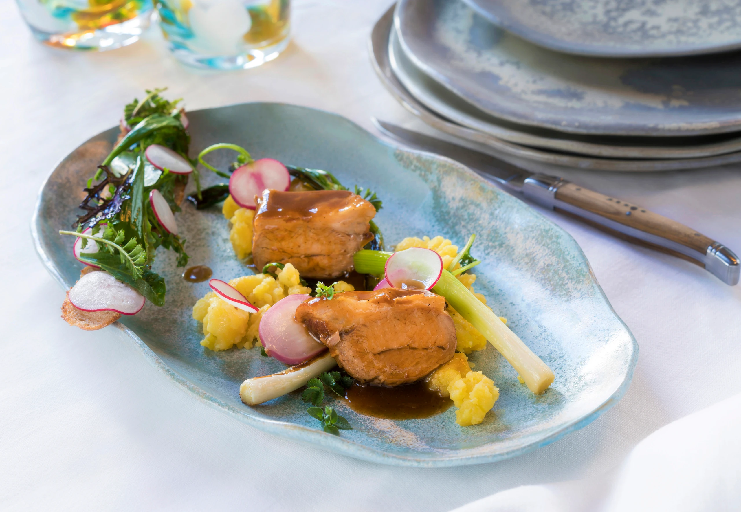 Fleisch in Stücke schneiden, mit Stampferdäpfel, Frühlingsgemüse und Kräuterbrot anrichten.