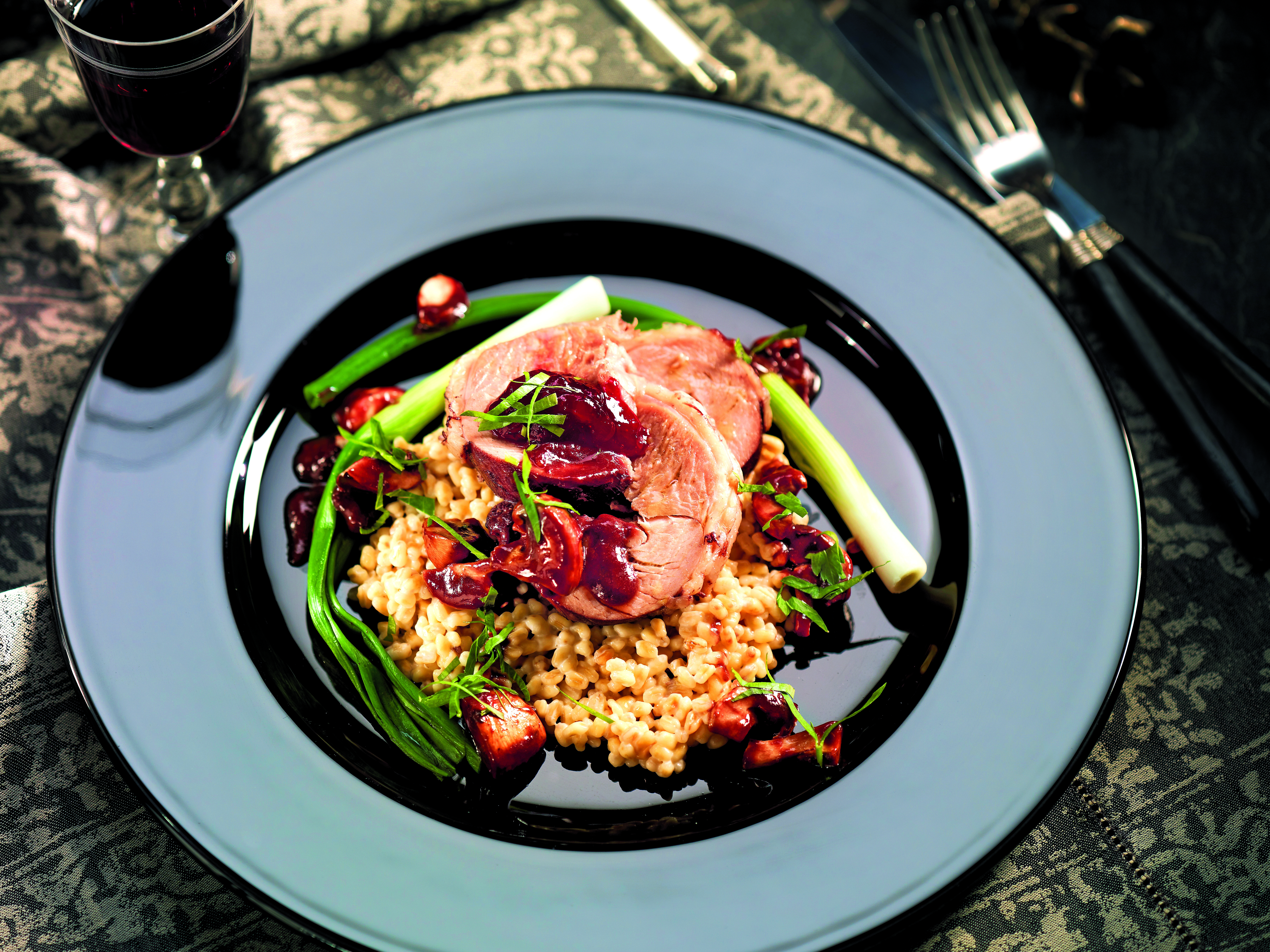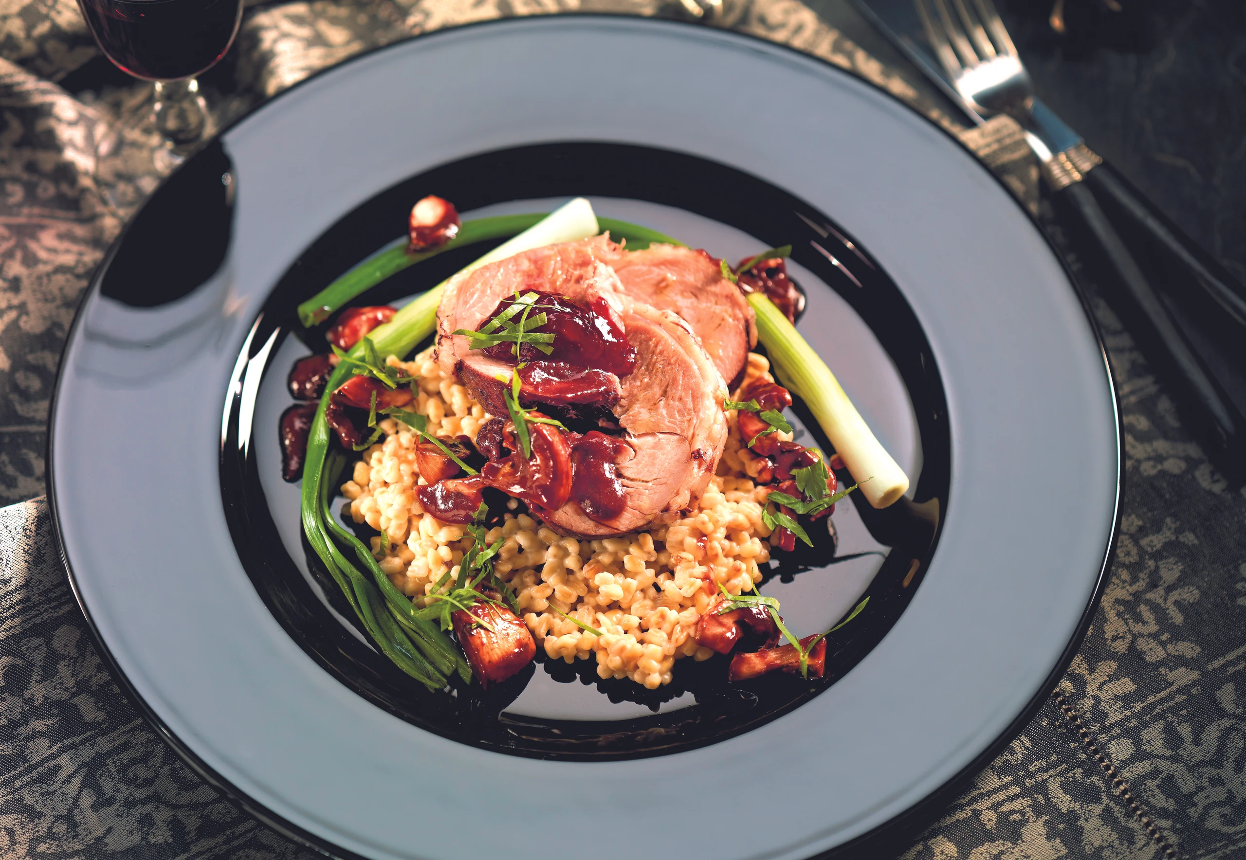 Keulen herausheben, den Spagat entfernen, Keulen warmstellen. Sauce durch ein Sieb gießen. Champignons in 1 EL Butter anschwitzen, mit Sauce aufgießen und kurz köcheln. Jungzwiebeln in übriger Butter zugedeckt dünsten. Keulen in Scheiben schneiden, mit Schwammerlsauce, Jungzwiebeln und Graupen-Risotto anrichten.