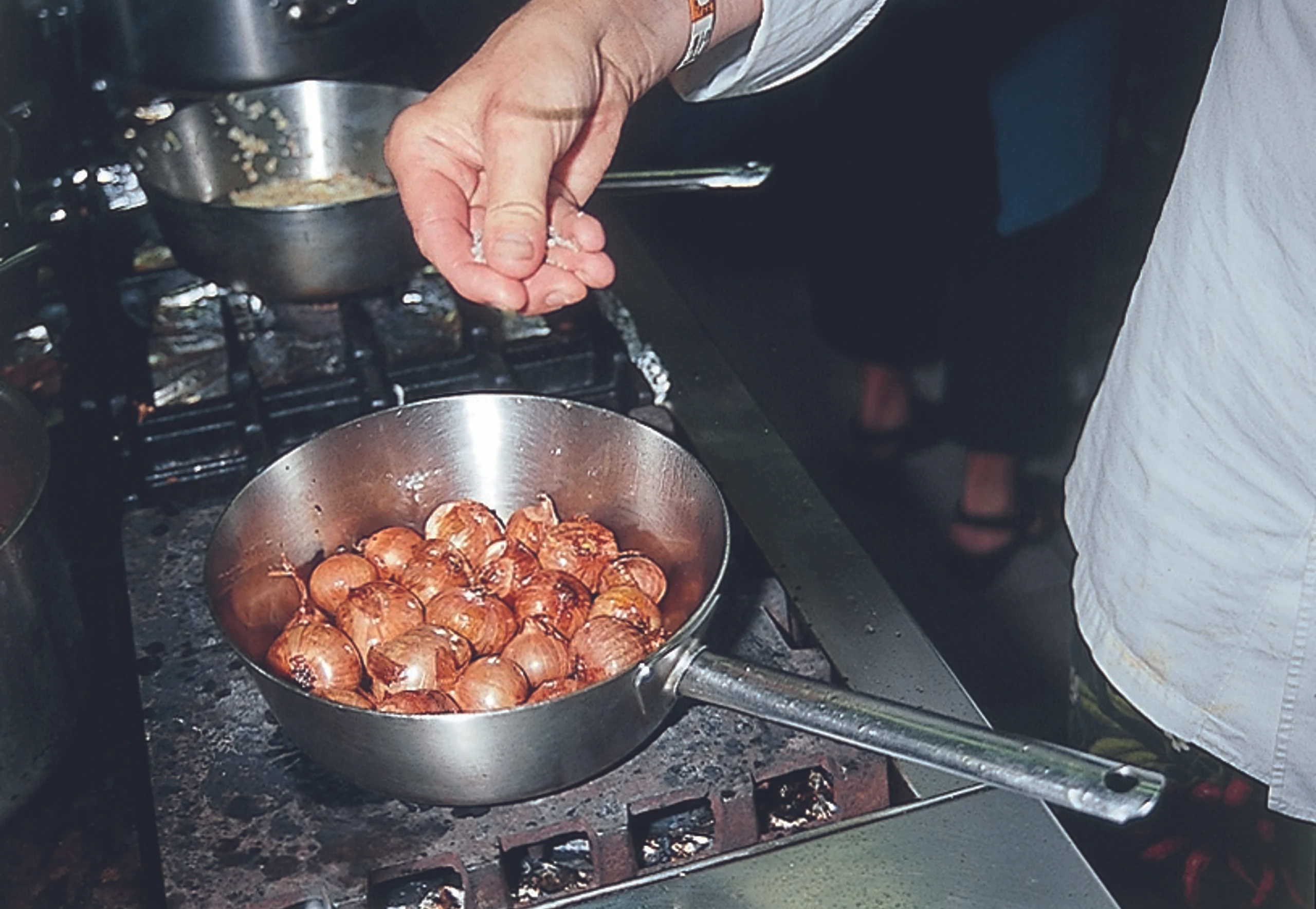 Zwiebeln mit Meersalz bestreuen, durchmischen und im Rohr (untere Schiene / Gitterrost) ca. 1 Stunde garen.