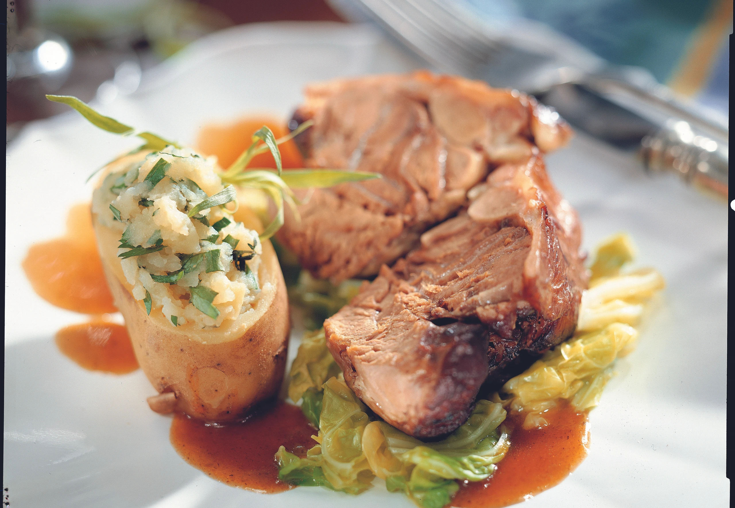 Geschmorte Schweinsstelze mit Erdäpfeln und Kohl