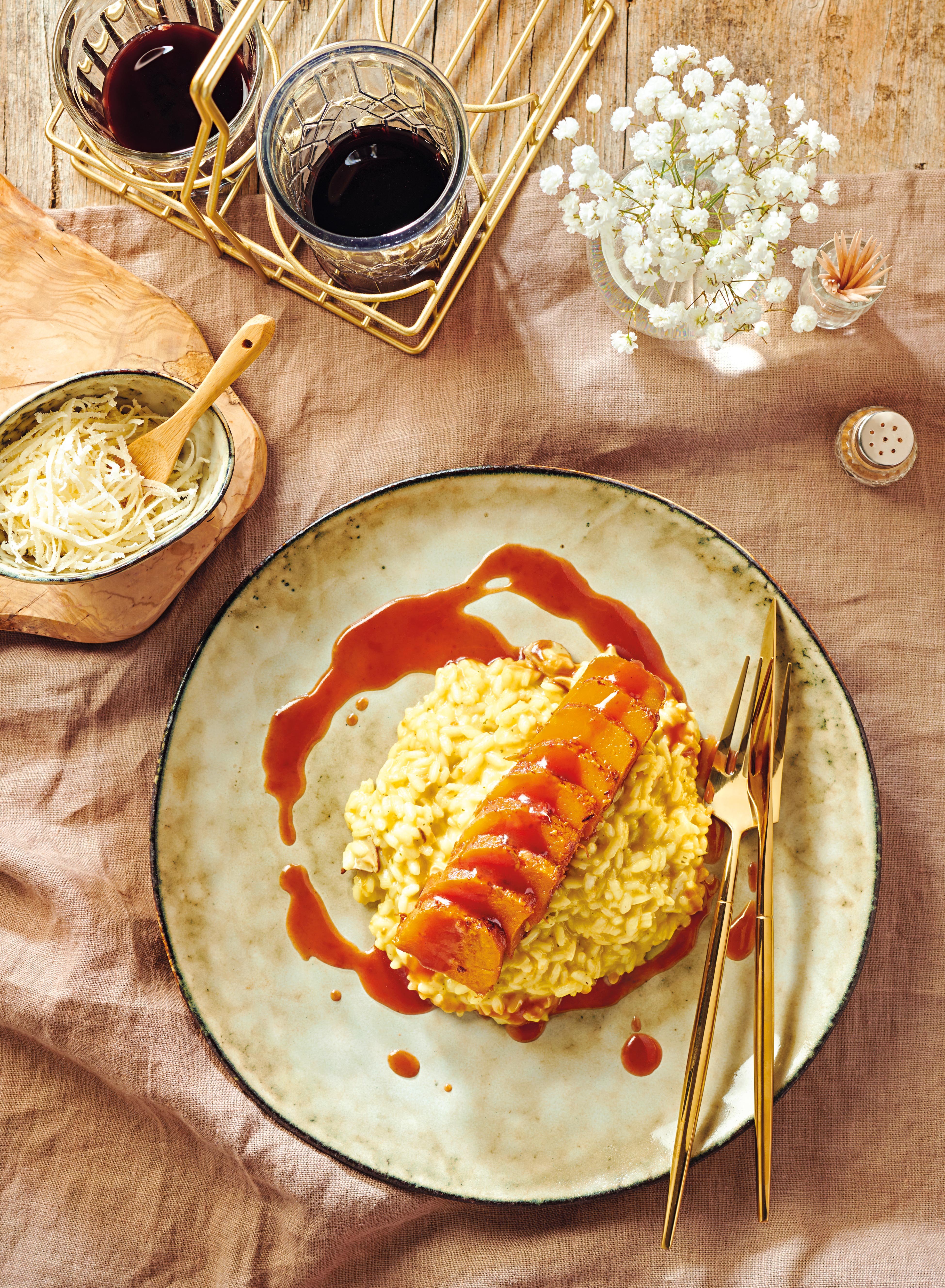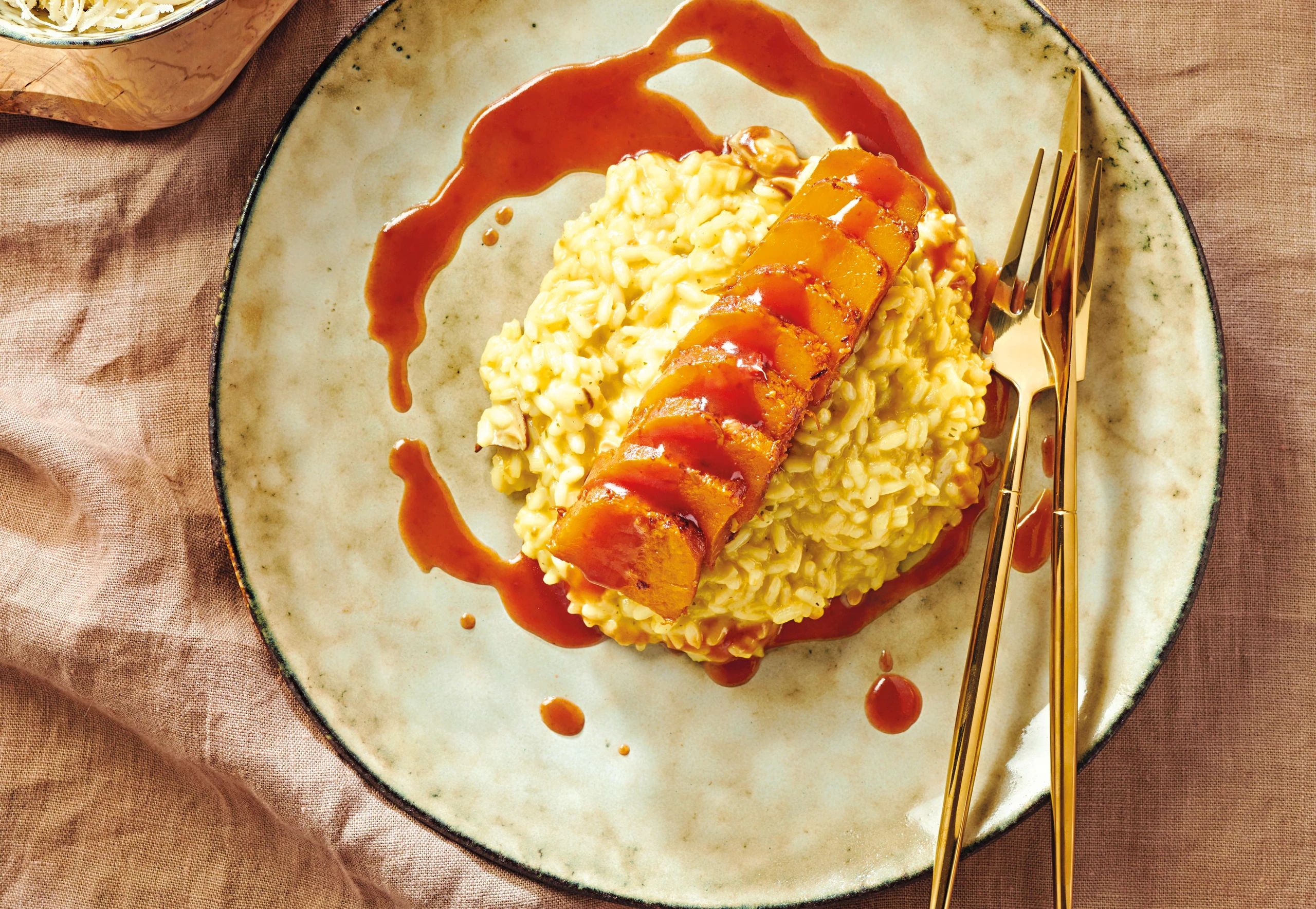 Risotto mit den Kürbisspalten und der Sauce servieren.