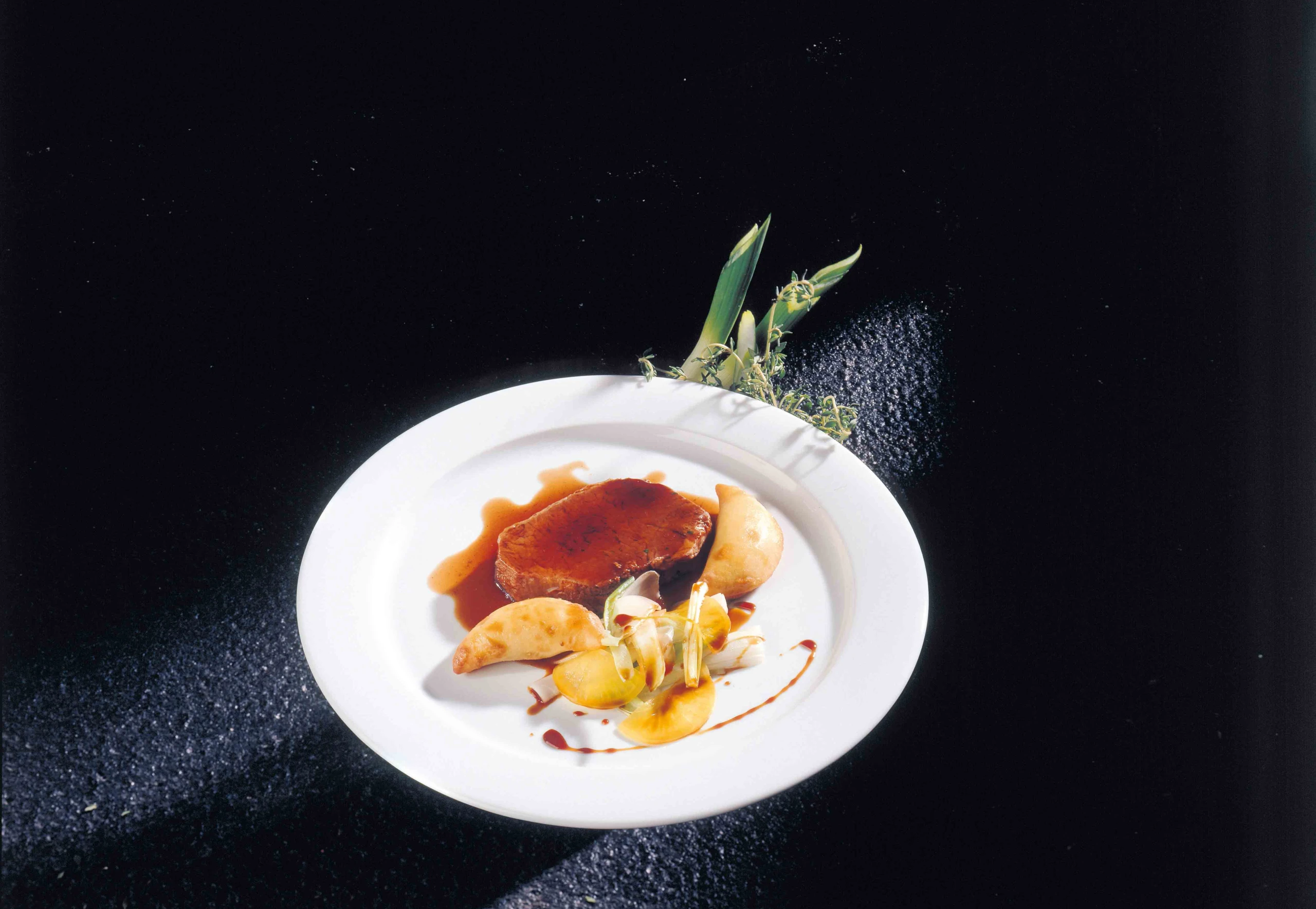 Zwiebel und Pilze in wenig Olivenöl scharf anbraten, mit Salz und Pfeffer würzen, Petersilie und Majoran untermischen. Fleisch in gleichdicke Scheiben schneiden und mit Sauce und Garnitur anrichten.