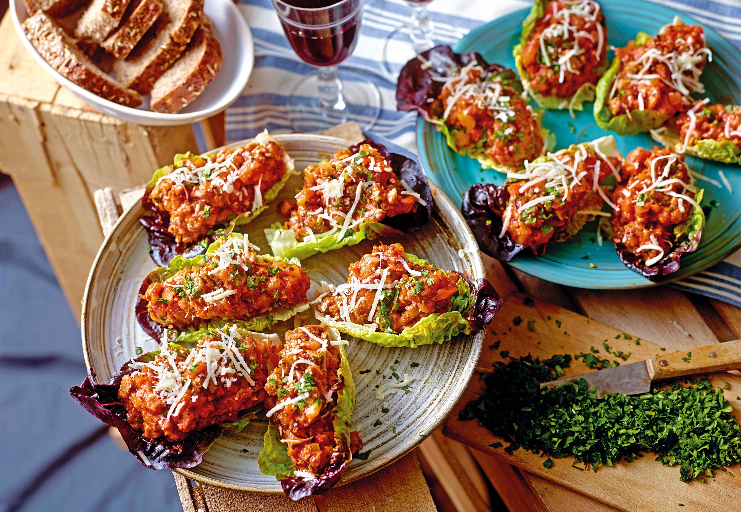 Salatblätter auflegen und behutsam ein wenig flach drücken. Blätter mit dem Ragout füllen, anrichten und mit Parmesan, Oregano und Petersilie bestreuen. Dazu passt dunkles Baguette.
