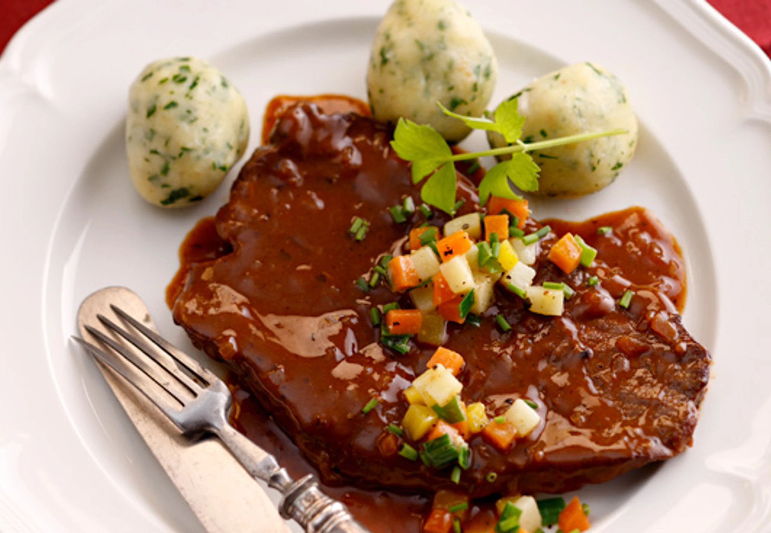 Geschmortes Rindsschnitzel mit Kräuter-Grießknöderln