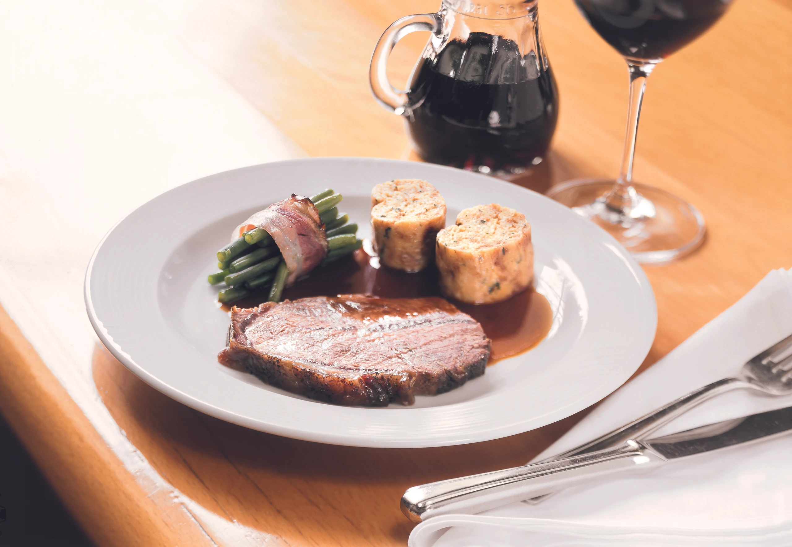Den an den Wänden und am Boden der Pfanne haftenden Bratensatz ablösen und mit dem entstandenen Saft verrühren, aufkochen, bis sich der Satz aufgelöst hat. Saft abseihen, restlichen Portwein zufügen, auf ca. 250 ml einkochen, evtl. kalte Butterflocken einrühren (montieren), Saft nicht mehr kochen. Braten in Scheiben schneiden und mit Knödel und Fisolen auf vorgewärmten Tellern anrichten.