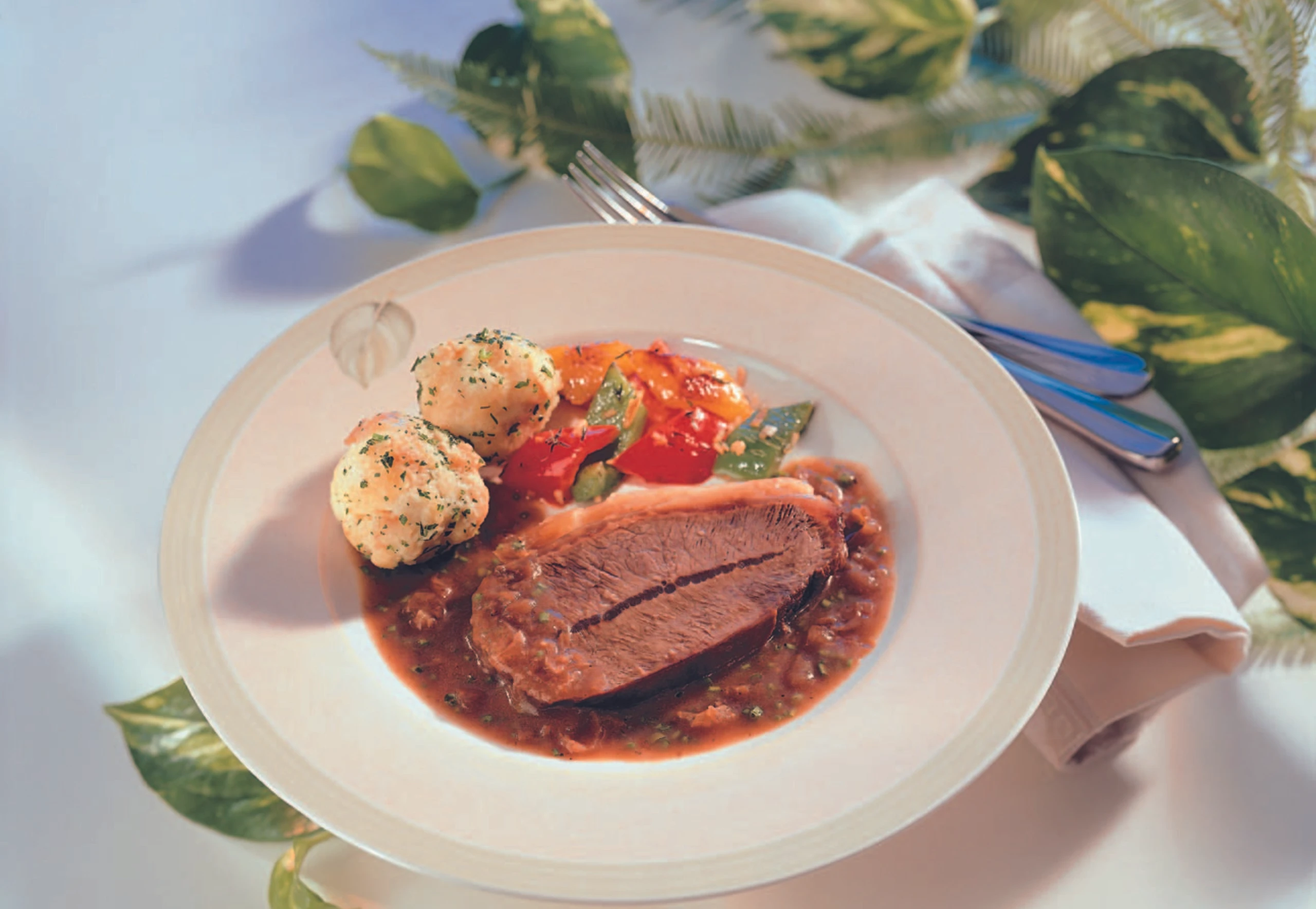 Stärke mit 1 EL kaltem Wasser glatt rühren. Sauce aufkochen, Stärke einrühren und ca. 1/2 Minute köcheln. Reservierte Zwiebelstücke und Schnittlauch untermischen und die Sauce nochmals erwärmen. Fleisch in ca. 1 cm dicke Scheiben schneiden, mit der Sauce und den Beilagen anrichten.