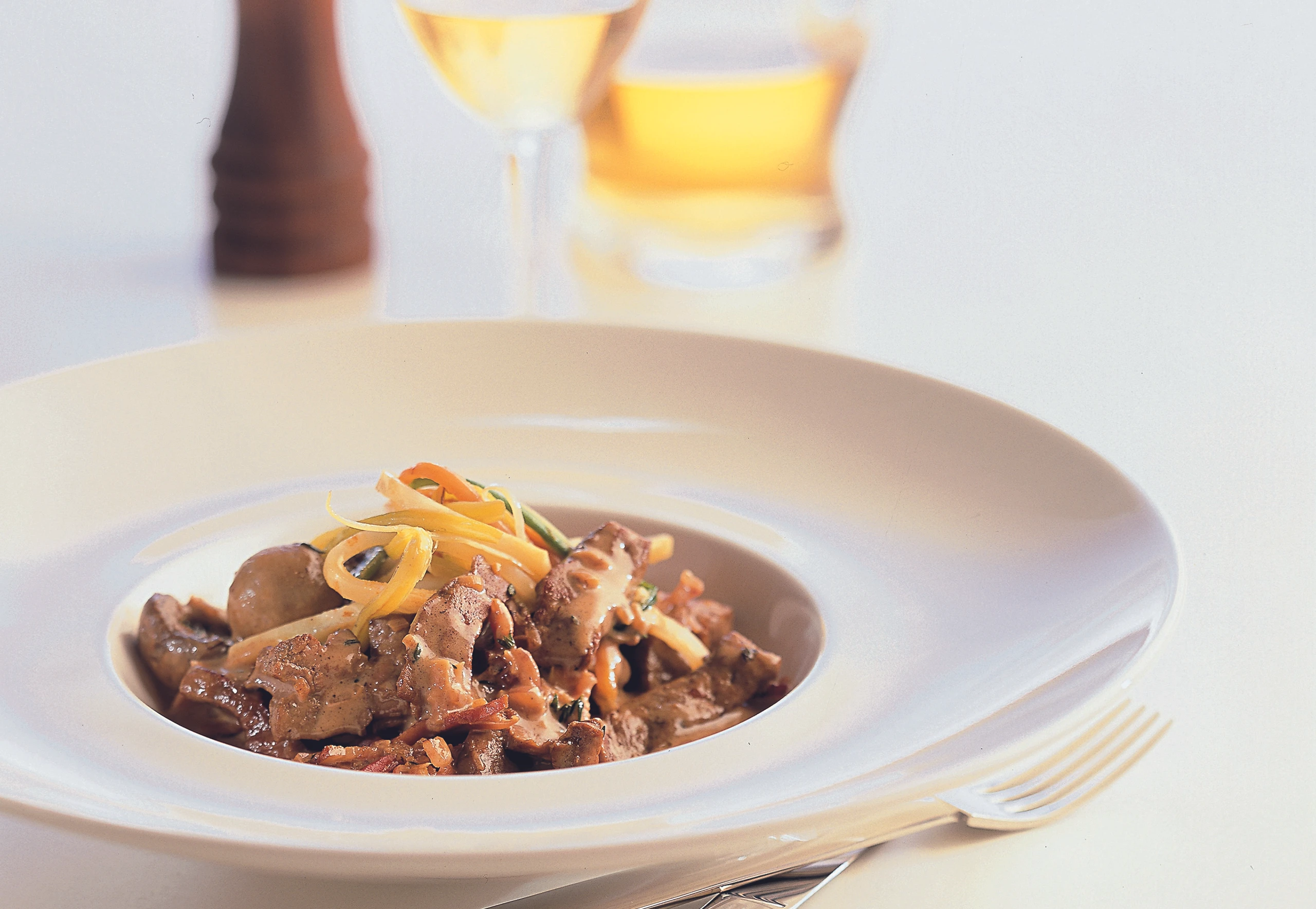 Geschnetzelte Kalbsleber mit Zwiebel, Speck und Champignons