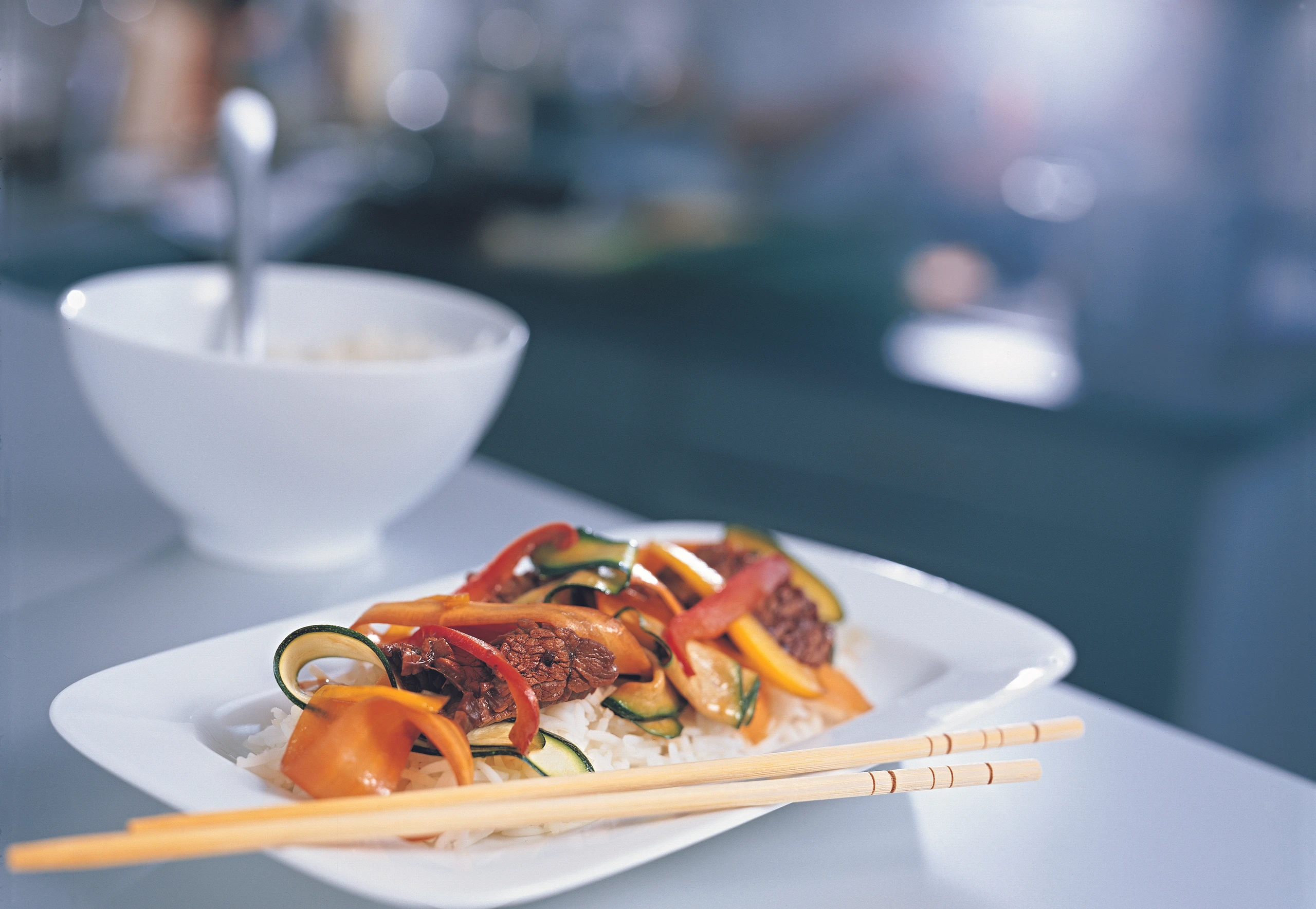 Gemüse zugeben, kurz mitbraten. Alles locker durchschwenken. Fleisch und Gemüse auf Basmatireis anrichten.