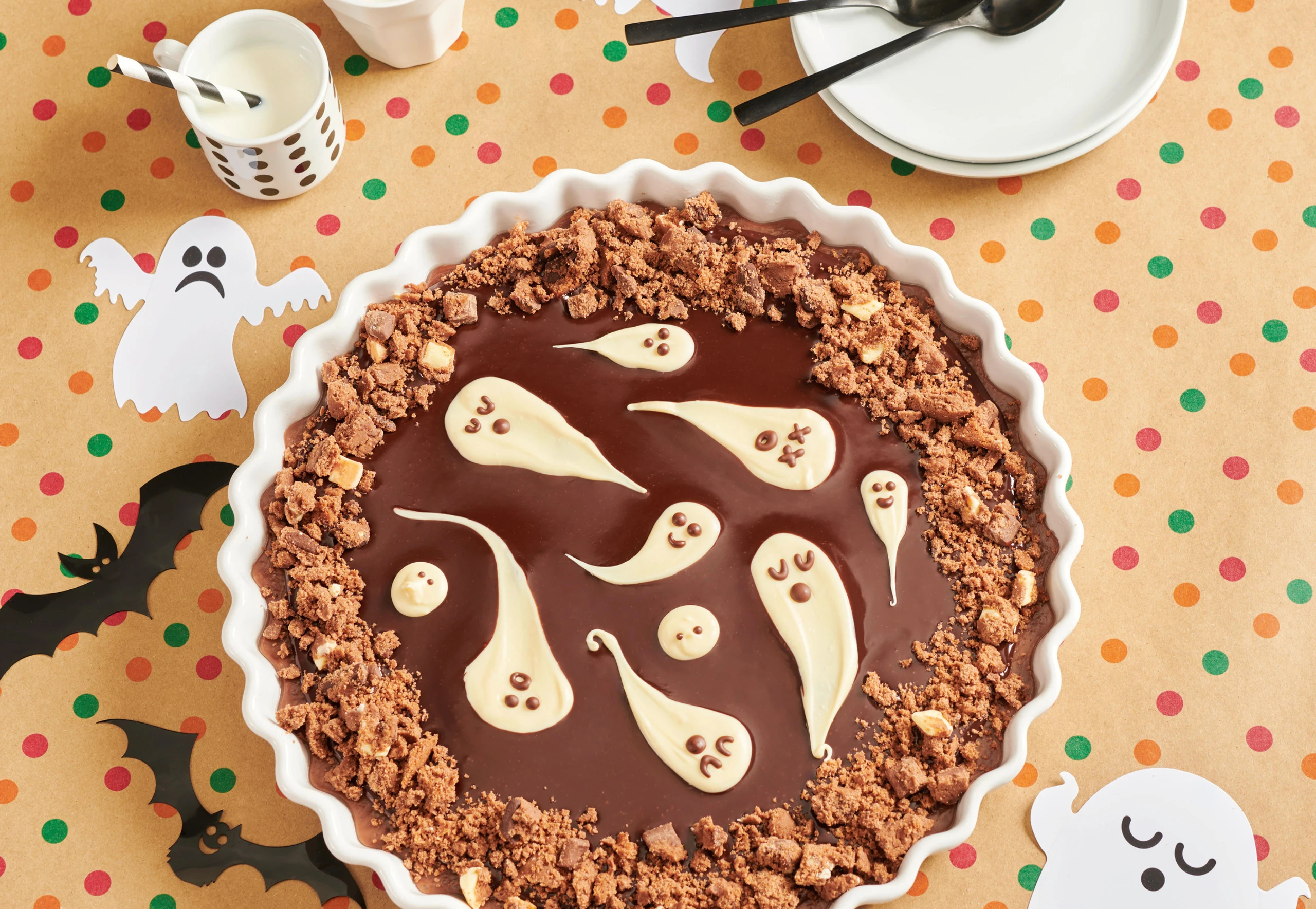 Für die Deko die Cookies zerbröseln und den Rand des „Schokobads“ damit bestreuen. Für die Geister mit der weißen Schokolade Tupfen auf der Ganache verteilen und vorsichtig verwischen. Mit der dunklen Schokolade Augen und Münder aufdressieren.