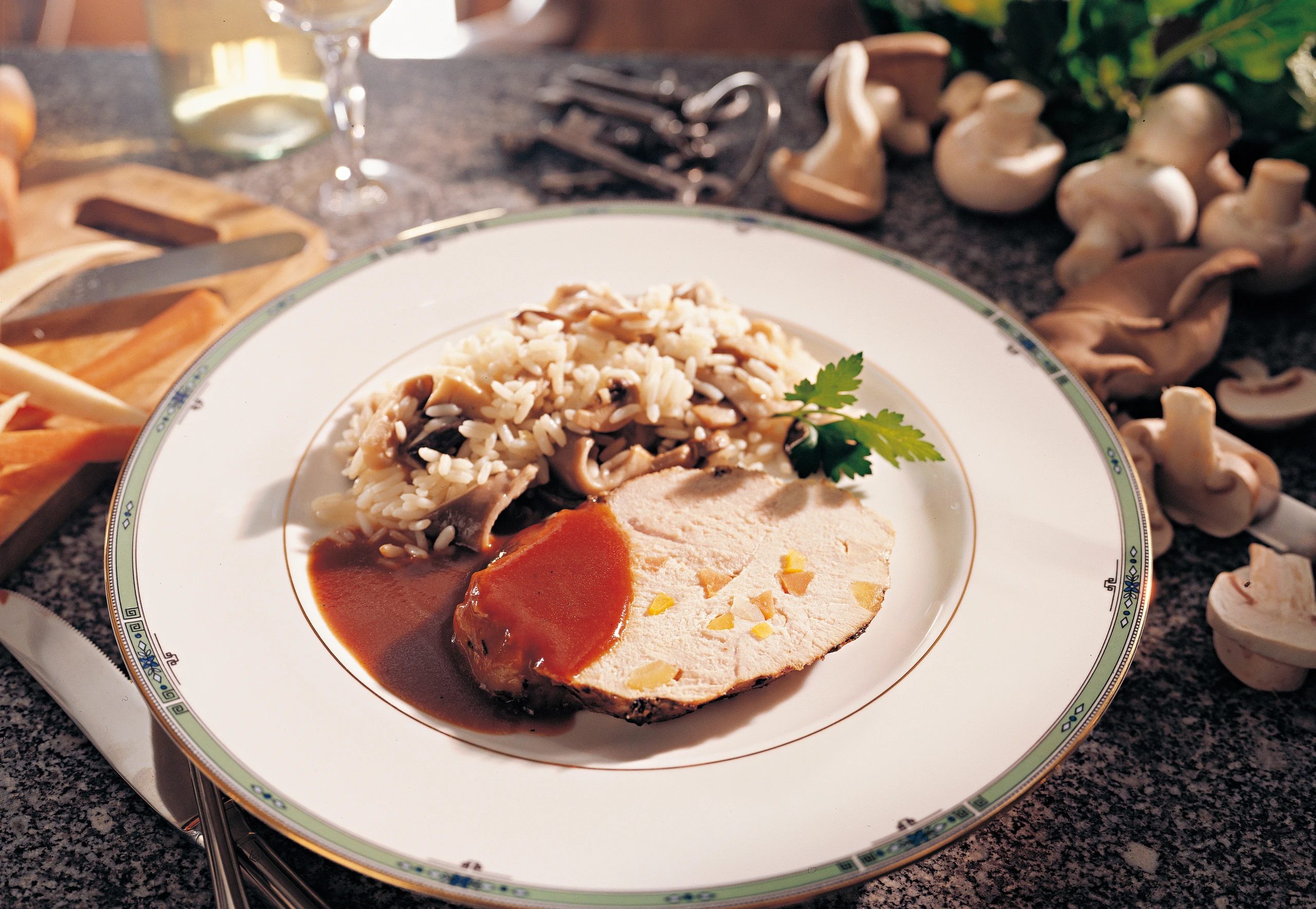 Fleisch aus der Pfanne heben und warmstellen. Bratrückstand mit Bratensaft aufgießen und aufkochen. Sauce durch ein feines Sieb gießen und mit Butter binden. Sauce nicht mehr kochen. Fleisch in dünne Scheiben schneiden und mit der Sauce und den Beilagen anrichten.