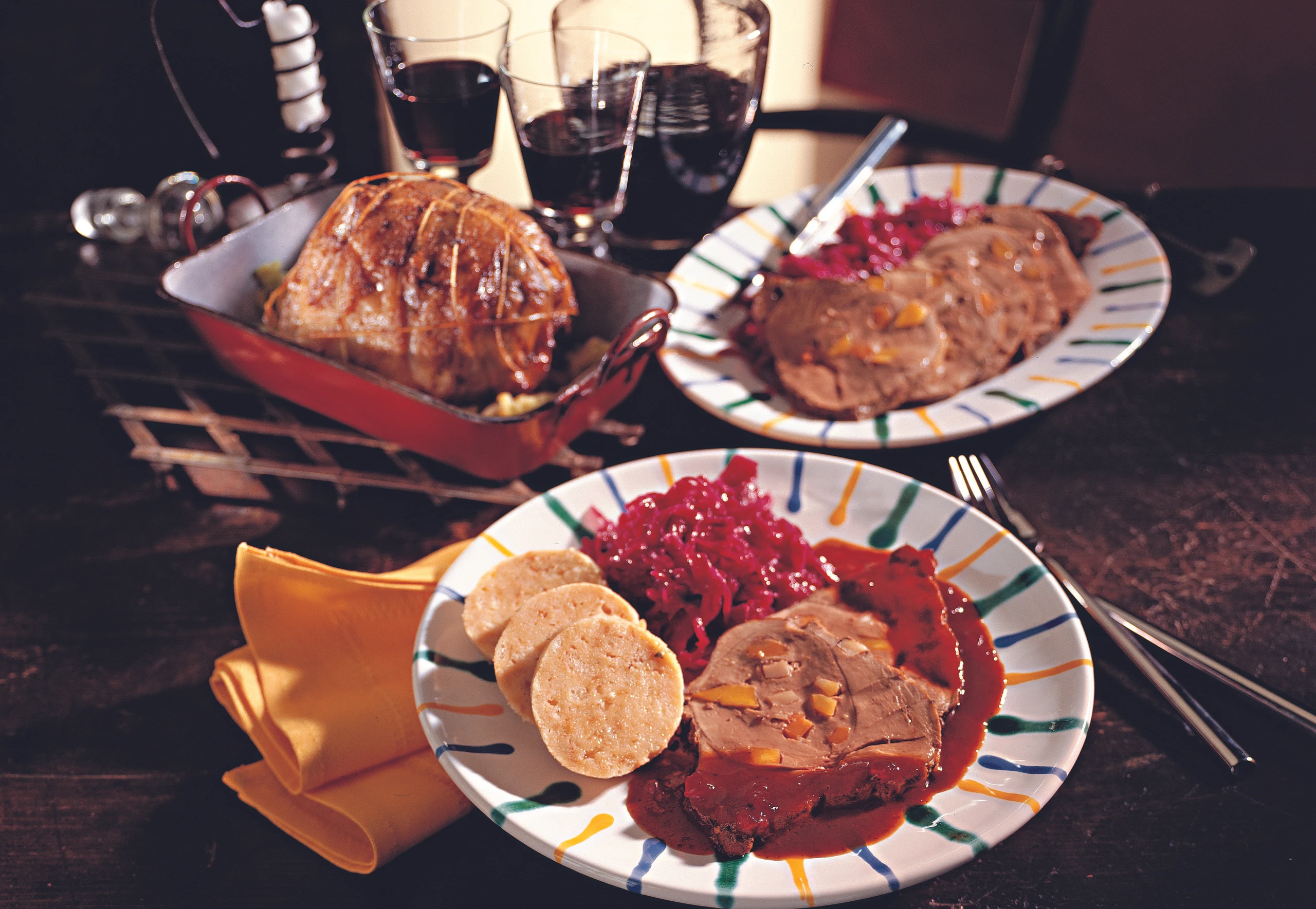 Bratrückstand erst mit Wein, dann mit Bratensaft aufgießen, 11/2 Minuten kochen, abseihen und das Preiselbeer-Kompott einrühren. Fleisch in Scheiben schneiden und mit der Sauce und Beilage anrichten. Dazu passen Semmelknödel.