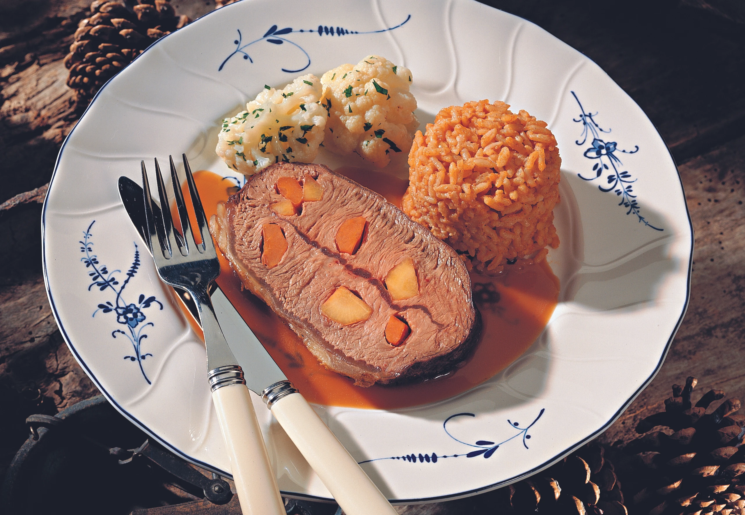Gespickter Wurzelbraten mit Paprikareis und Karfiol