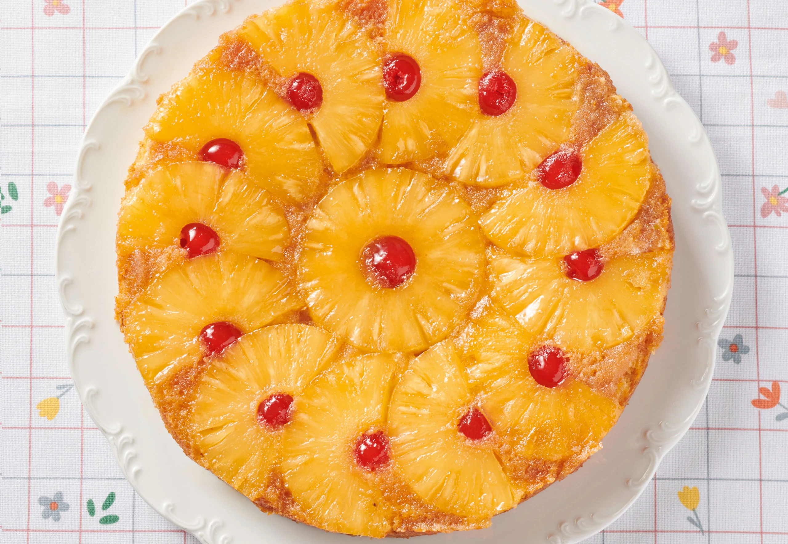 Rohr auf 180 °C Ober-/Unterhitze vorheizen. Ananasscheiben möglichst eng in die Form auf das Karamell schichten (ein paar Scheiben halbieren, damit alle hineinpassen). Leerflächen mit den Cocktailkirschen belegen.