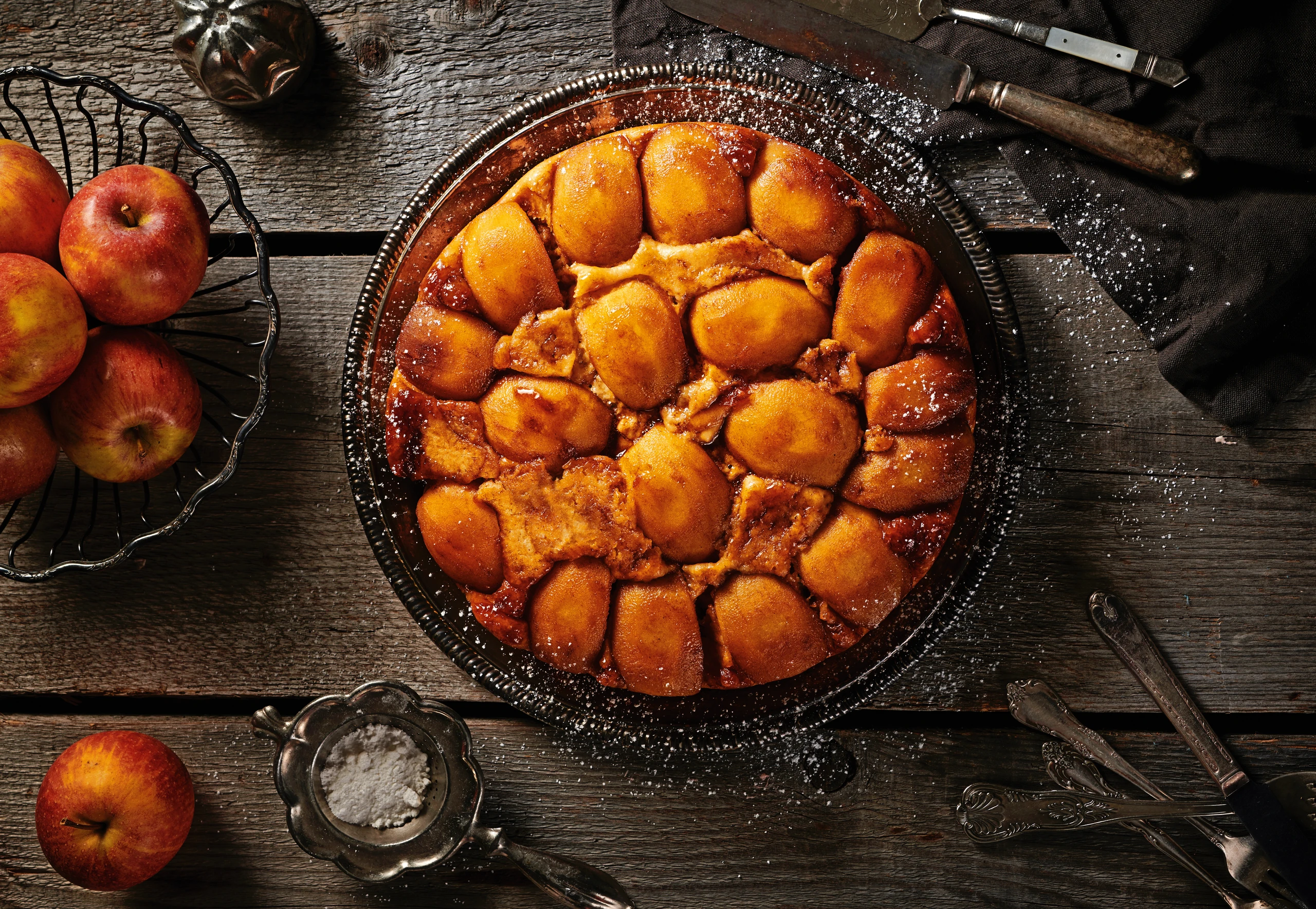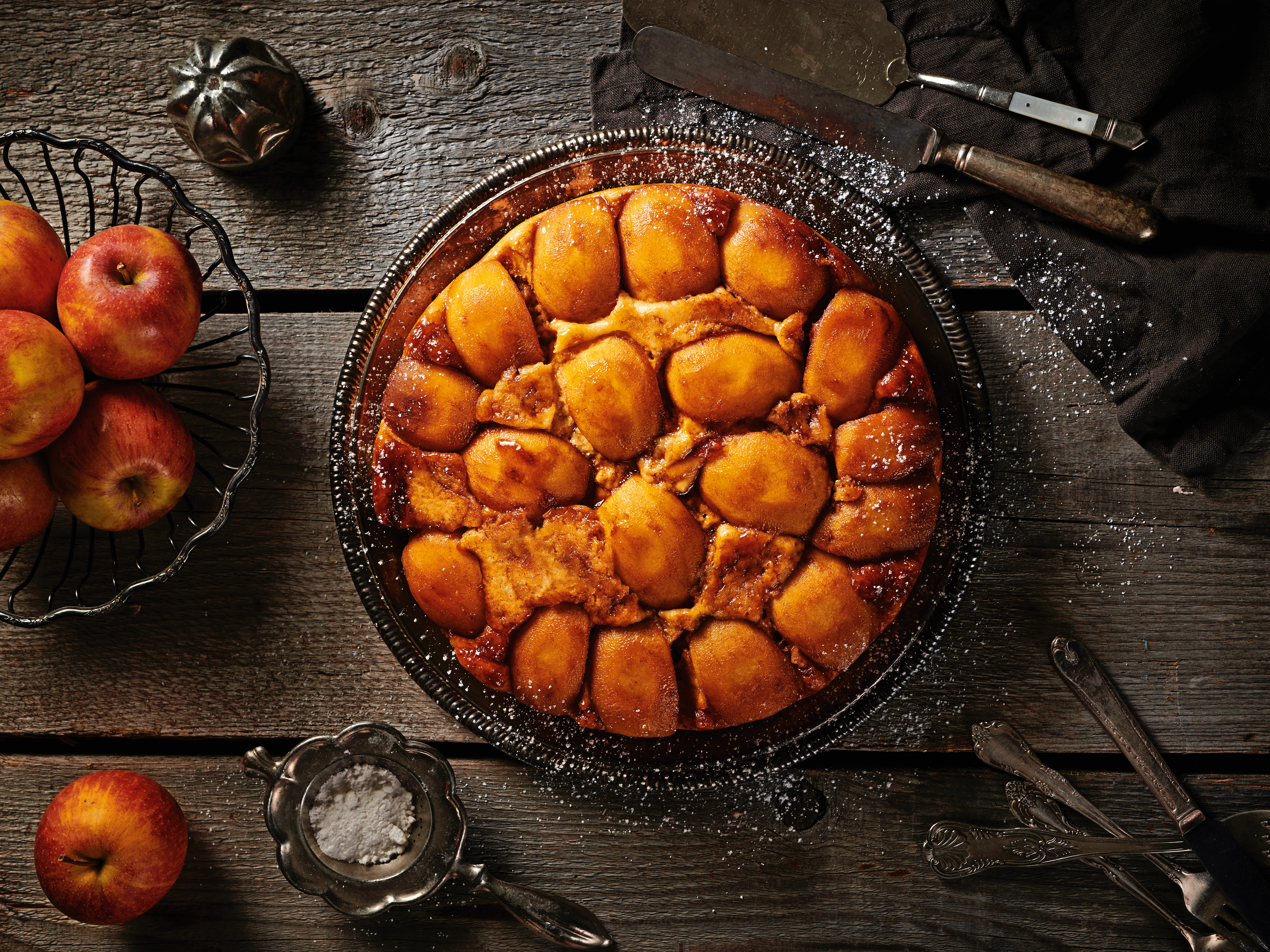 Springform (26 cm) mit Butter ausstreichen. Boden der Form mit zurechtgeschnittenem Backpapier auslegen. Äpfel in der Form verteilen und übriges Karamell darüber träufeln.