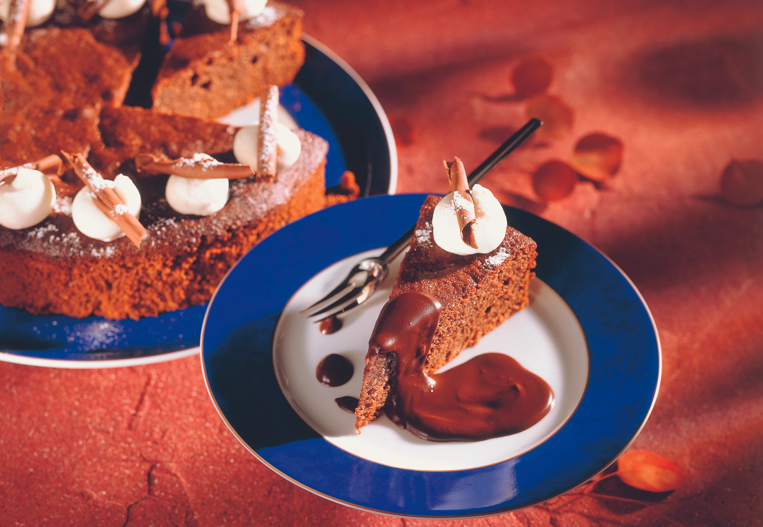 Torte mit geschlagenem Obers und Schokoröllchen garnieren. Torte mit Staubzucker bestreuen und mit der Schokoladesauce servieren.