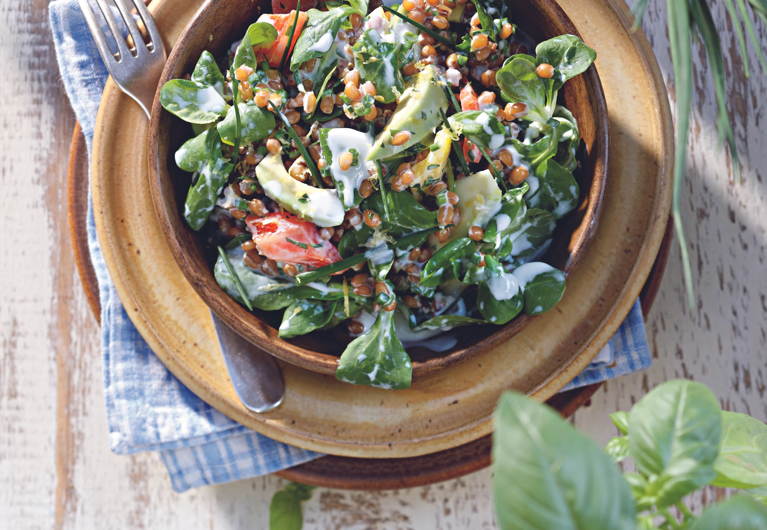 Für das Dressing Buttermilch mit Zitronensaft und abgeriebener -schale, Salz und Pfeffer vermischen, Öl einrühren. Getreide, Gemüse, Vogerlsalat und Kräuter mit dem Dressing vermischen.