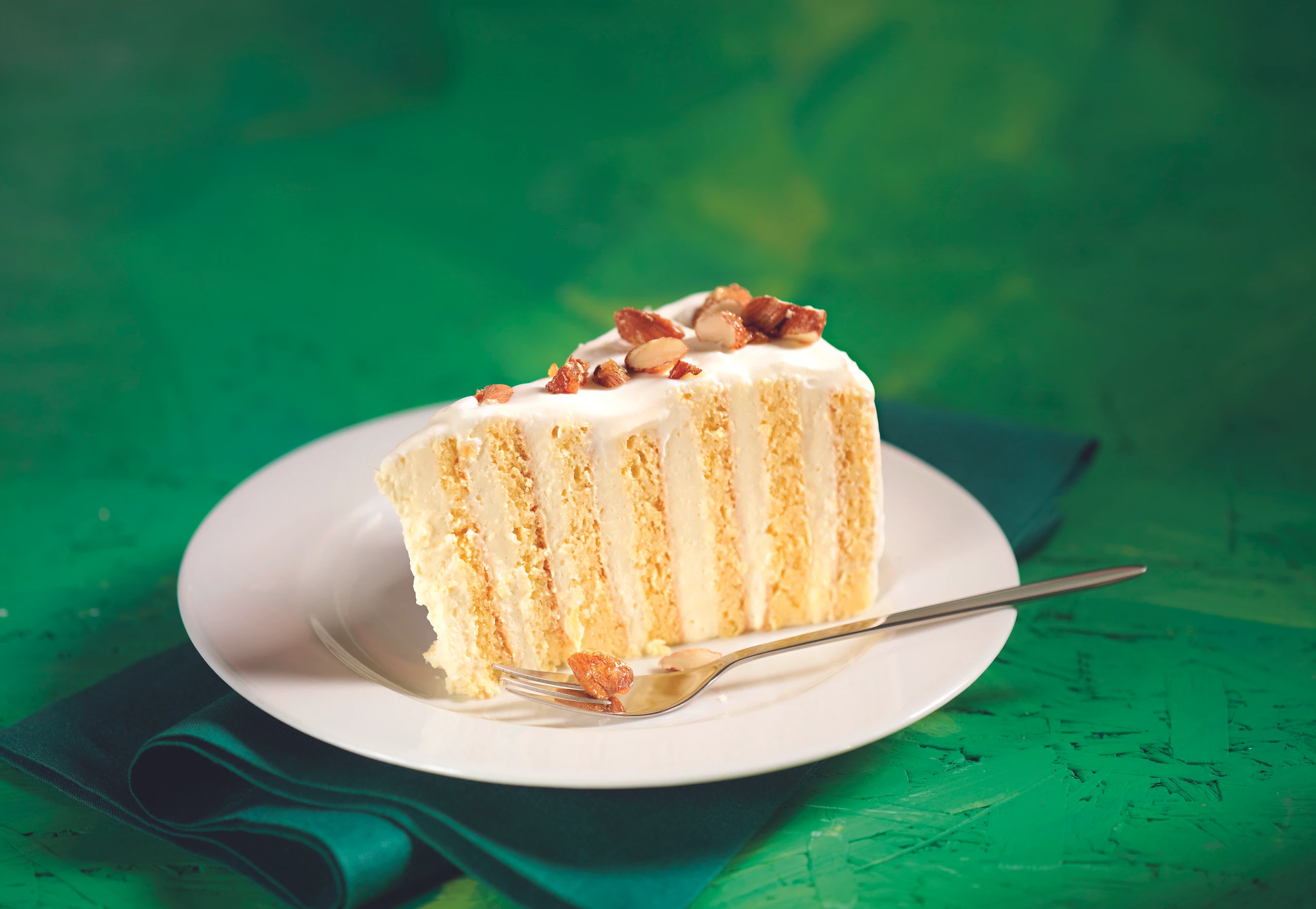 Für die Garnitur Obers schlagen. Torte mit einem kleinen Messer vom Tortenreifen losschneiden. Reifen erweitern und abheben. Torte mit Obers rundum wellenförmig einstreichen und mit Mandeln bestreuen.