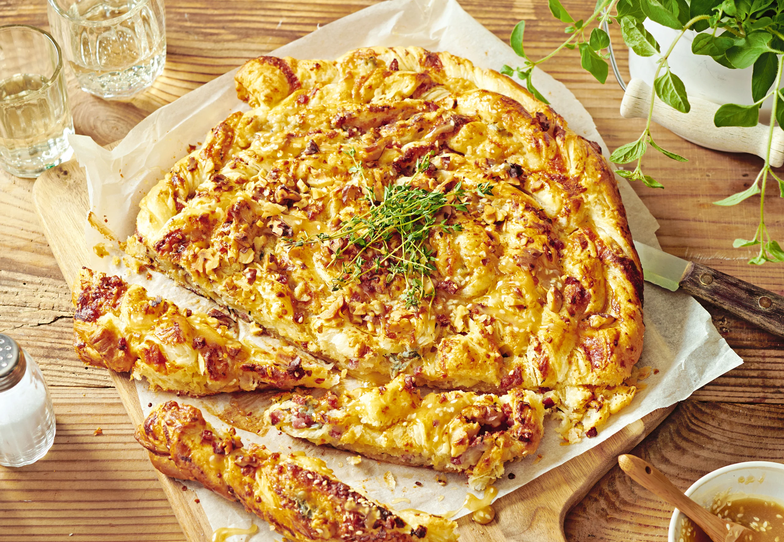 Gewickelter Blätterteigkuchen mit Käse und Speck