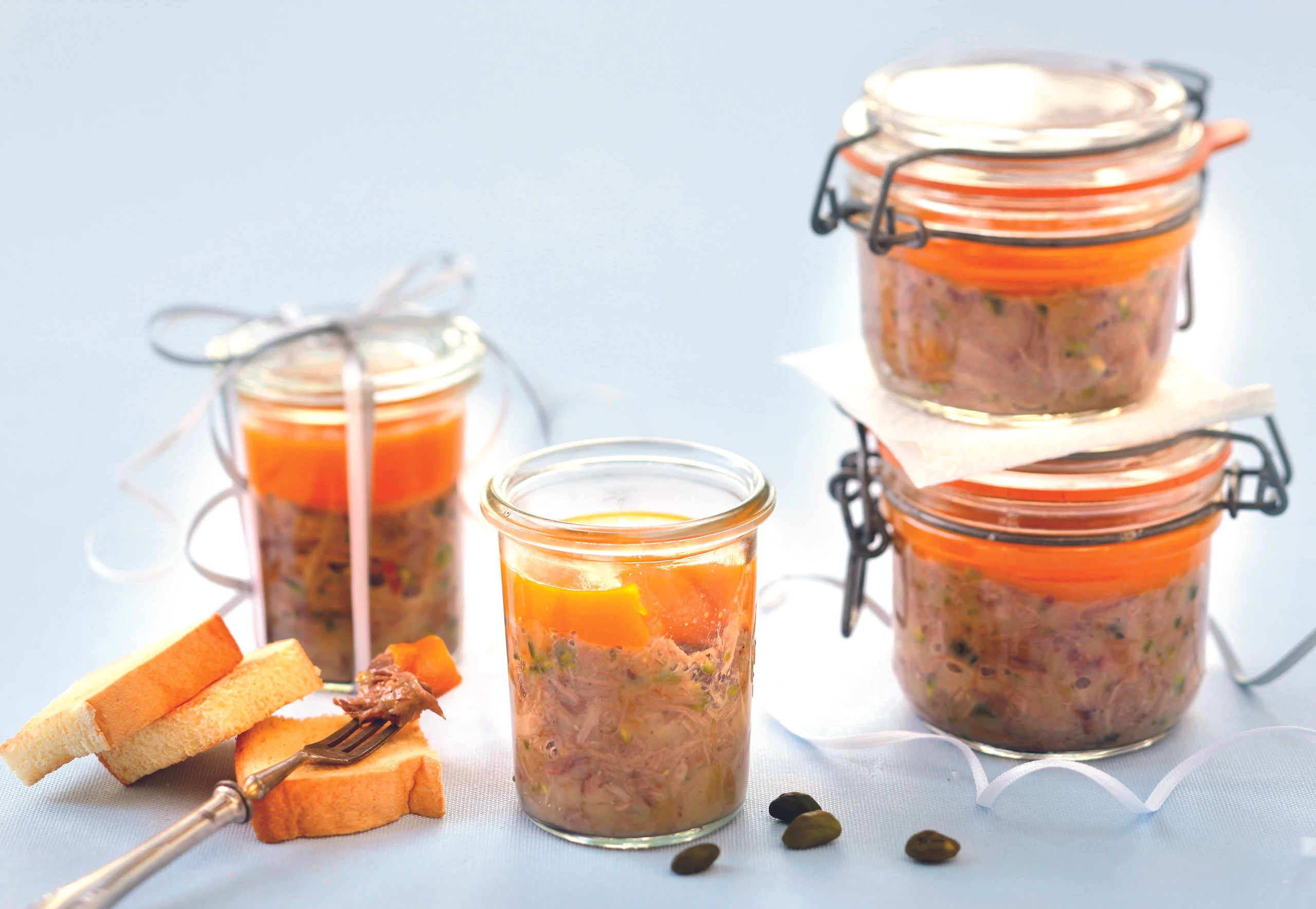 Gelee auf die Rillettes gießen, die Gläser gut verschließen und kalt stellen.