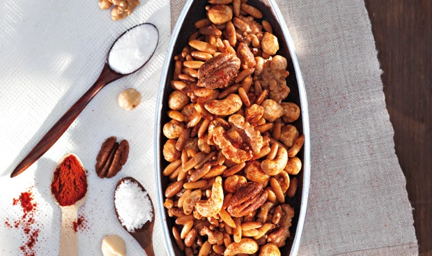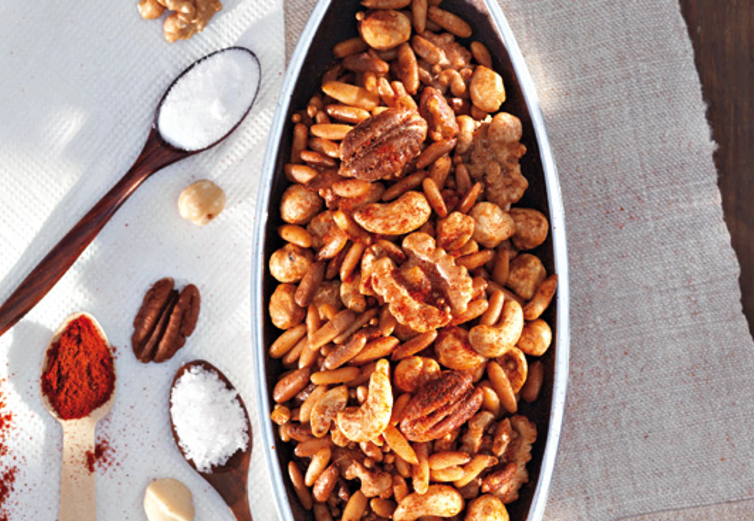 Cashews, Nüsse, Zucker, Gewürze und Rosmarin in einer Schüssel vermischen. Eiklar mit 1 guten Prise Salz aufschlagen. Eiklar unter die Nussmischung ziehen und großzügig auf dem Blech verteilen. Im Rohr (mittlere Schiene) knusprig rösten (ca. 20 Minuten), mehrmals durchmischen.