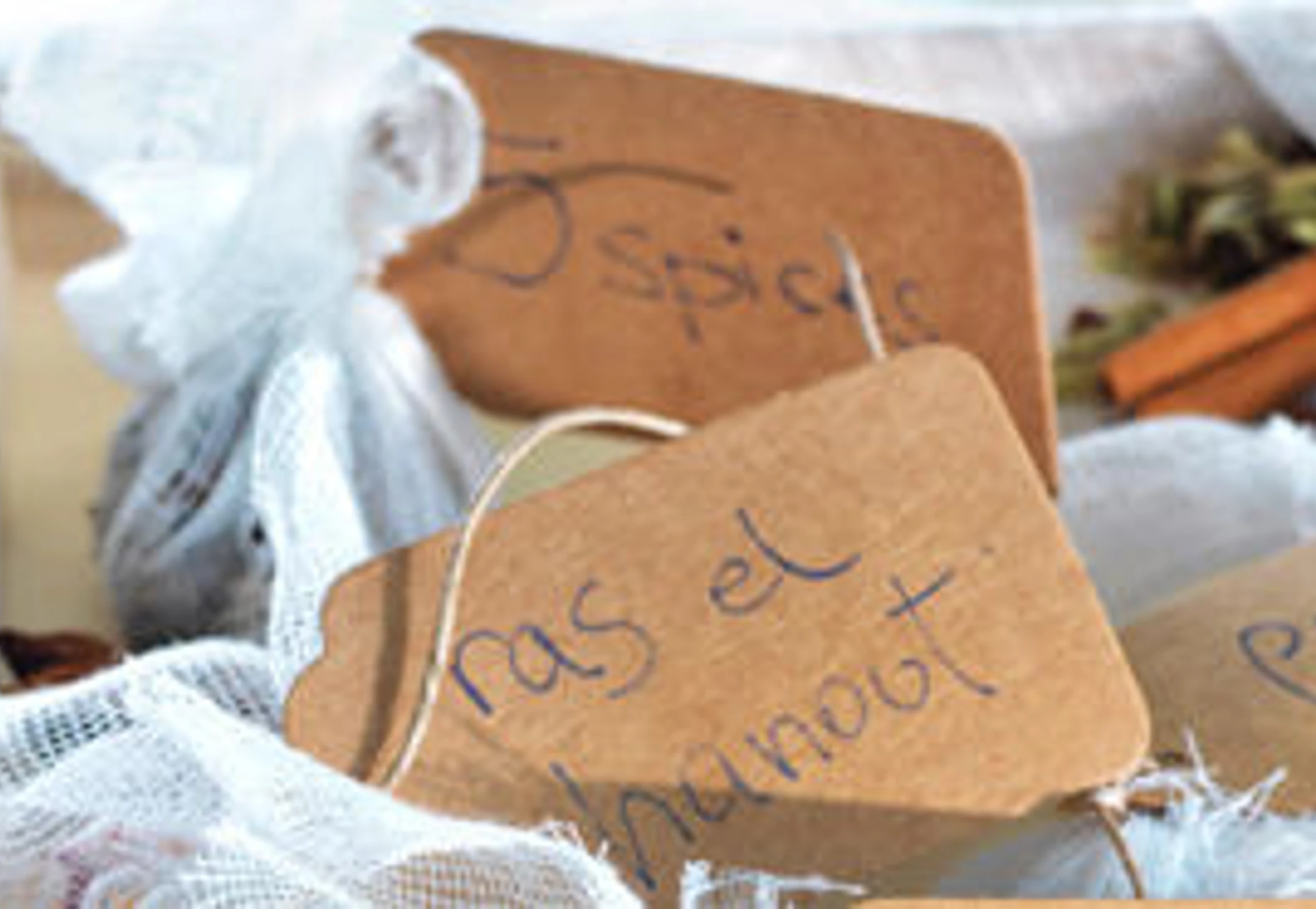 Die Gewürzmischungen jeweils auf je 2 Mulltücher (ca. 15 x 15 cm) legen und mit Küchengarn zubinden. Mit selbst gebastelten Etiketten versehen.