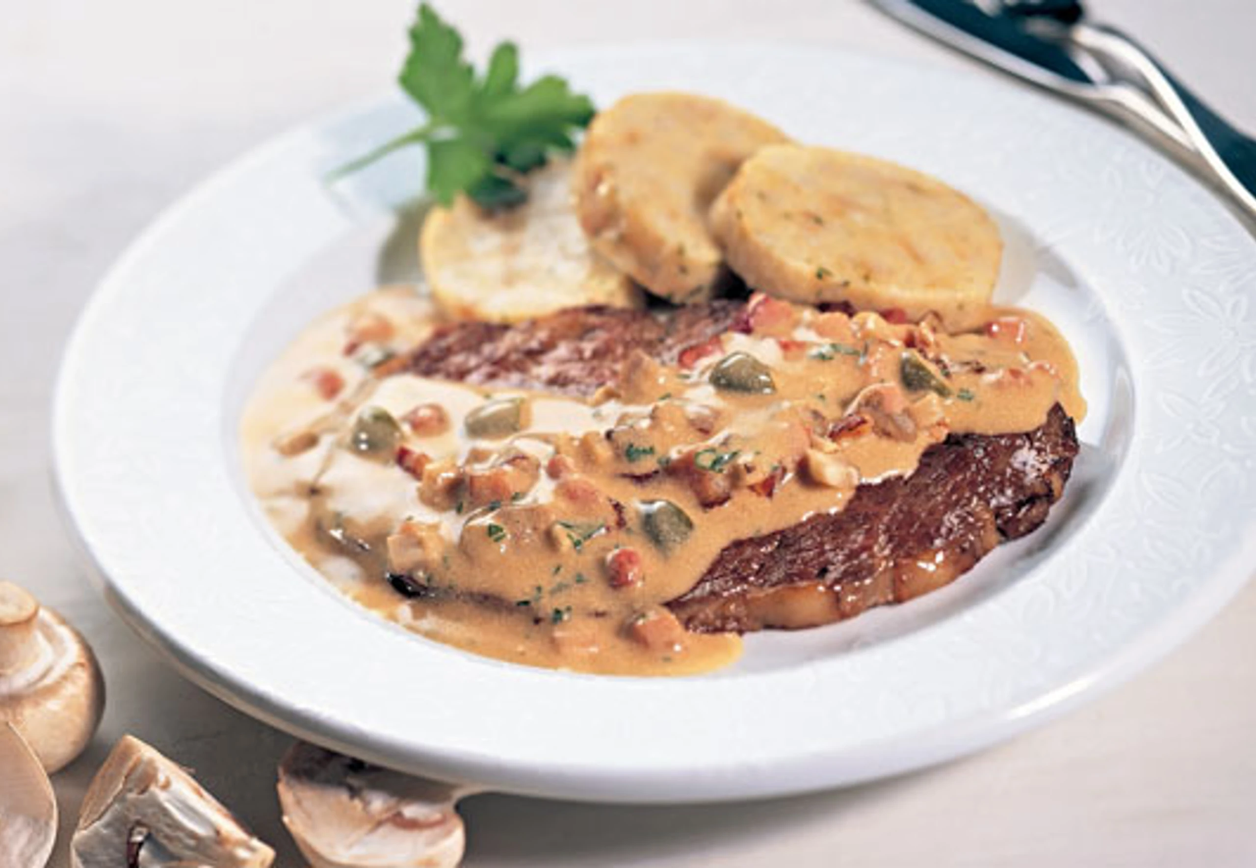 Schnitzel herausnehmen. Sauce mit dem Bratrückstand vermischen, Schnitzel einlegen und kurz ziehen lassen. Dazu passen Serviettenknödel.