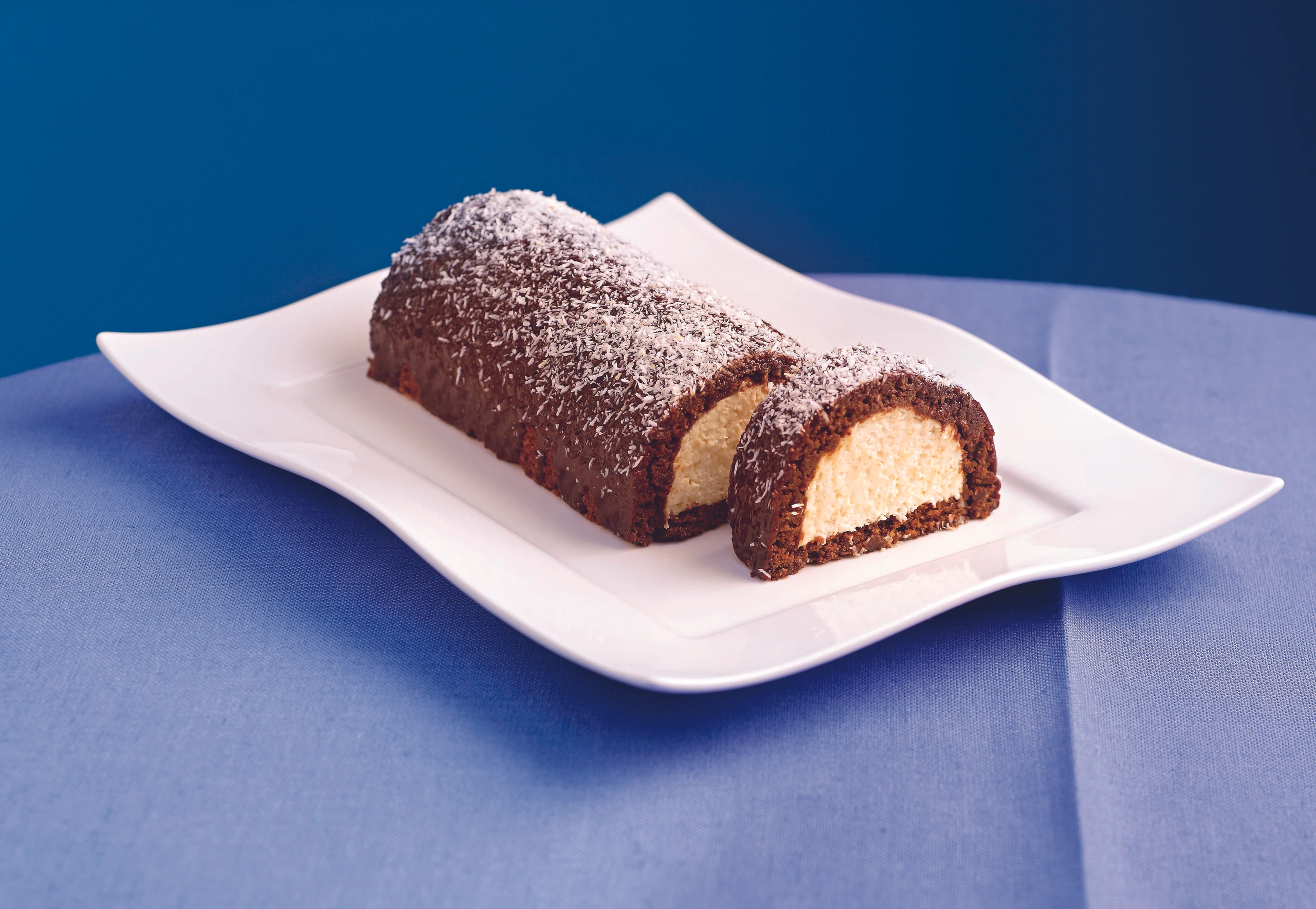 Terrine aus der Form stürzen und die Folie abziehen. Terrine mit Schokolade und Kokosette garnieren und portionieren.