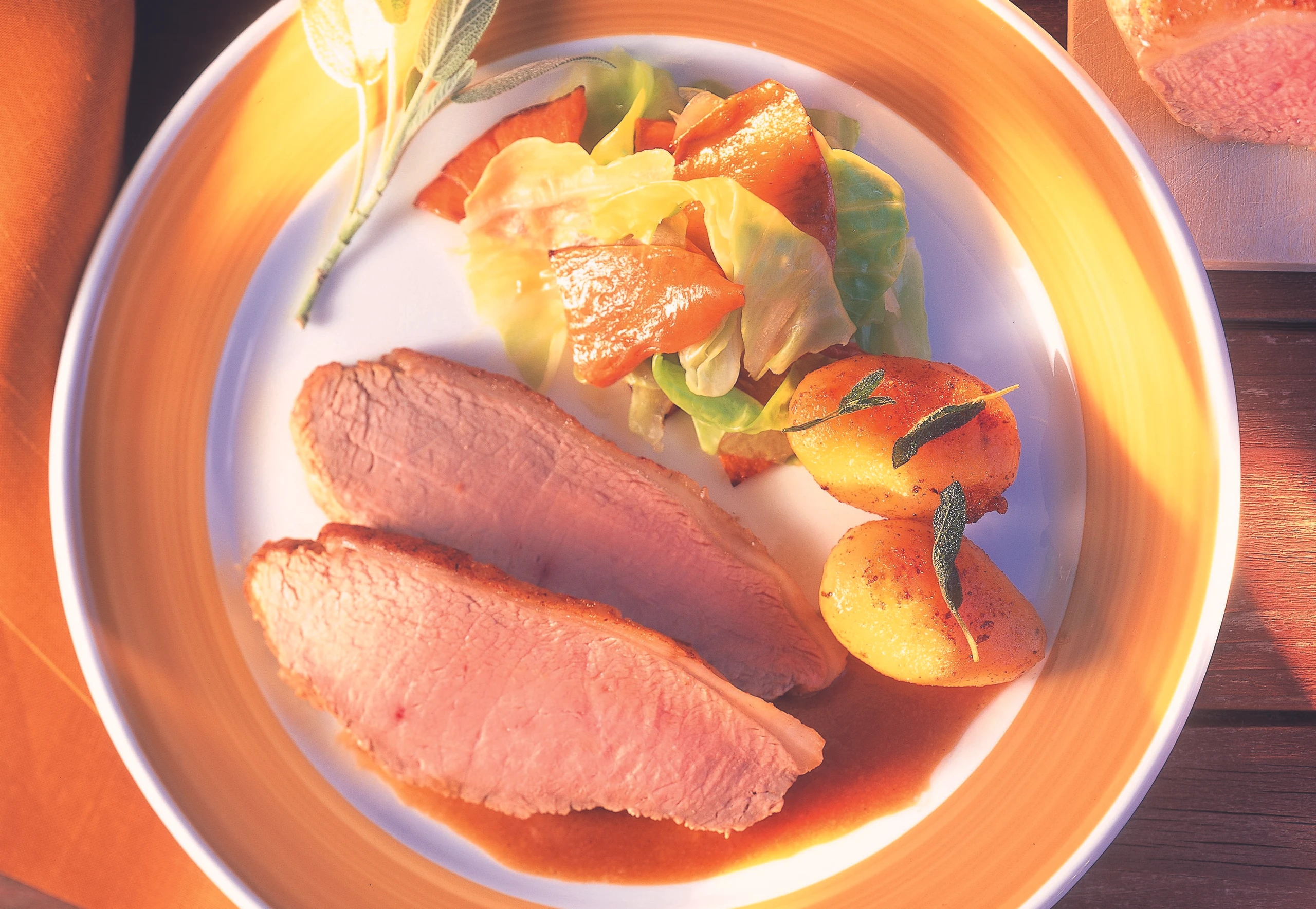 Bratensaft durch ein feines Sieb gießen. Fleisch in gleich dicke Scheiben schneiden. Fleisch mit dem Bratensaft, den Erdäpfeln und dem Kürbiskraut (siehe Rezept) anrichten.