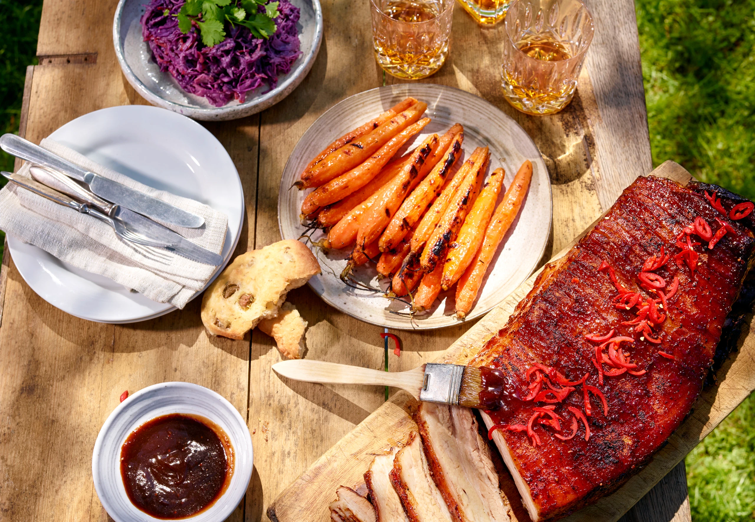 Ein wenig von der Glasur beiseitestellen. Schweinebauch mit der übrigen Glasur rundum einstreichen und mehrfach in Alufolie wickeln. Fleisch direkt auf den Rost legen und ca. 1 ½ Stunden grillen. Die Kerntemperatur sollte ca. 75°C betragen (mit einem Thermometer prüfen). Fleisch aus der Folie wickeln, auf den Rost legen und noch ca. 15 Minuten grillen. Dabei öfter mit übriger Glasur bestreichen. Parallel dazu Karotten auf den Rost legen und rundum grillen.