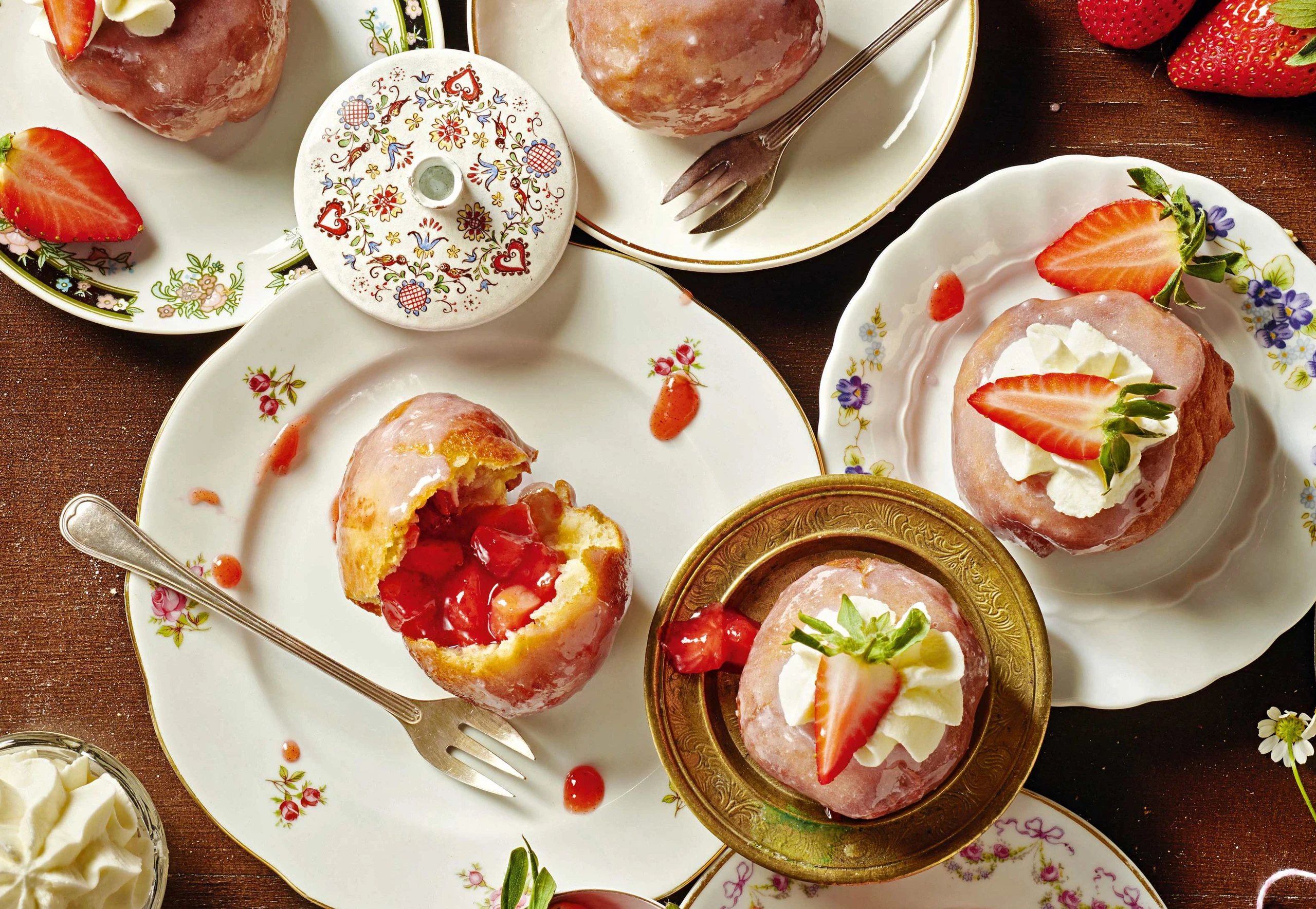 Für die Deko die Erdbeeren vierteln. Obers cremig mixen und in einen Dressiersack mit Sterntülle füllen. Beignets mit dem Obers und den Erdbeeren verzieren.