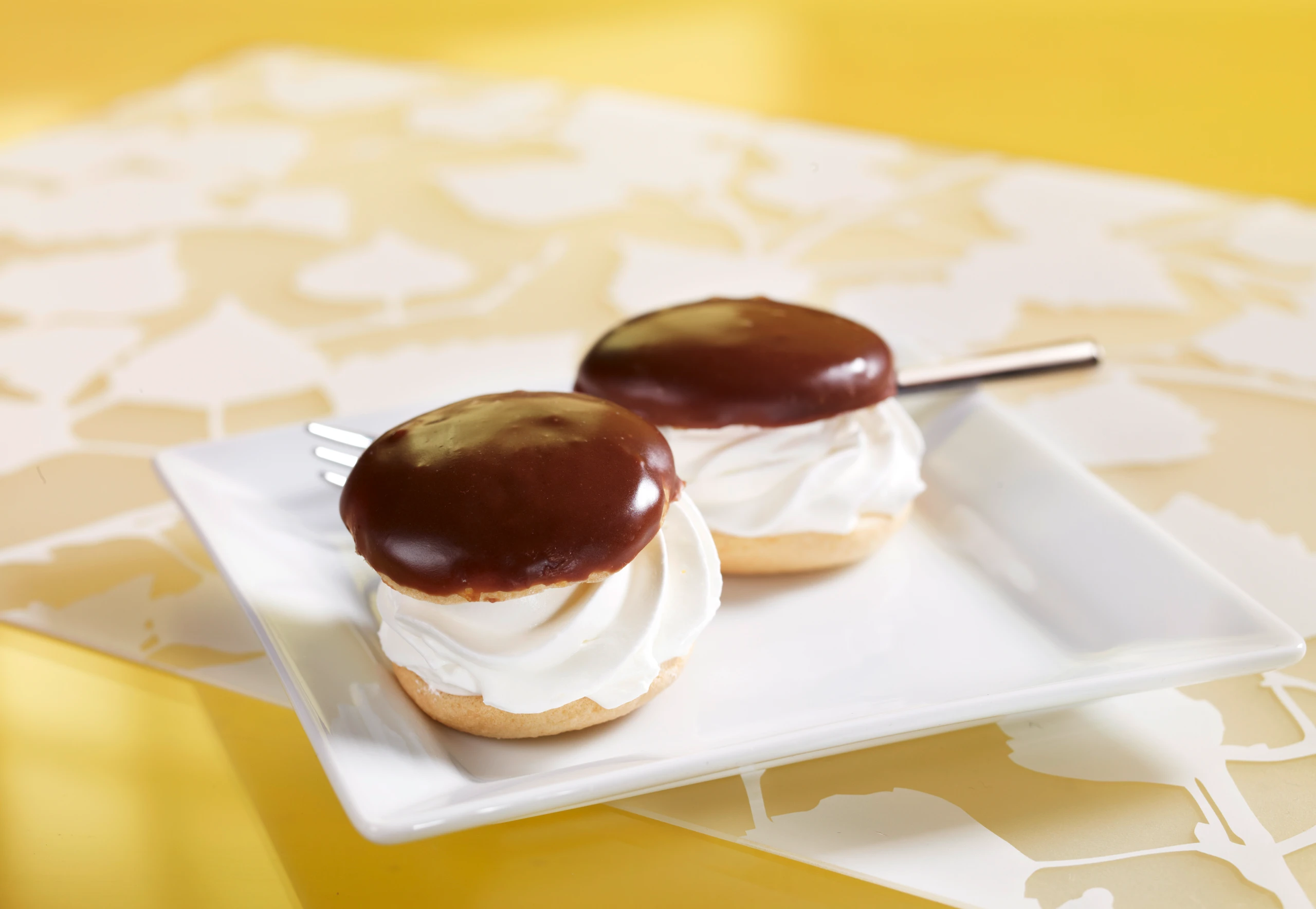Für die Fülle Obers halbfest schlagen, mit dem Staubzucker vermischen und in einen Dressiersack mit Sterntülle (Ø 8 mm) füllen. Obers auf die Krapfenböden dressieren, Deckel darauf setzen und behutsam andrücken.