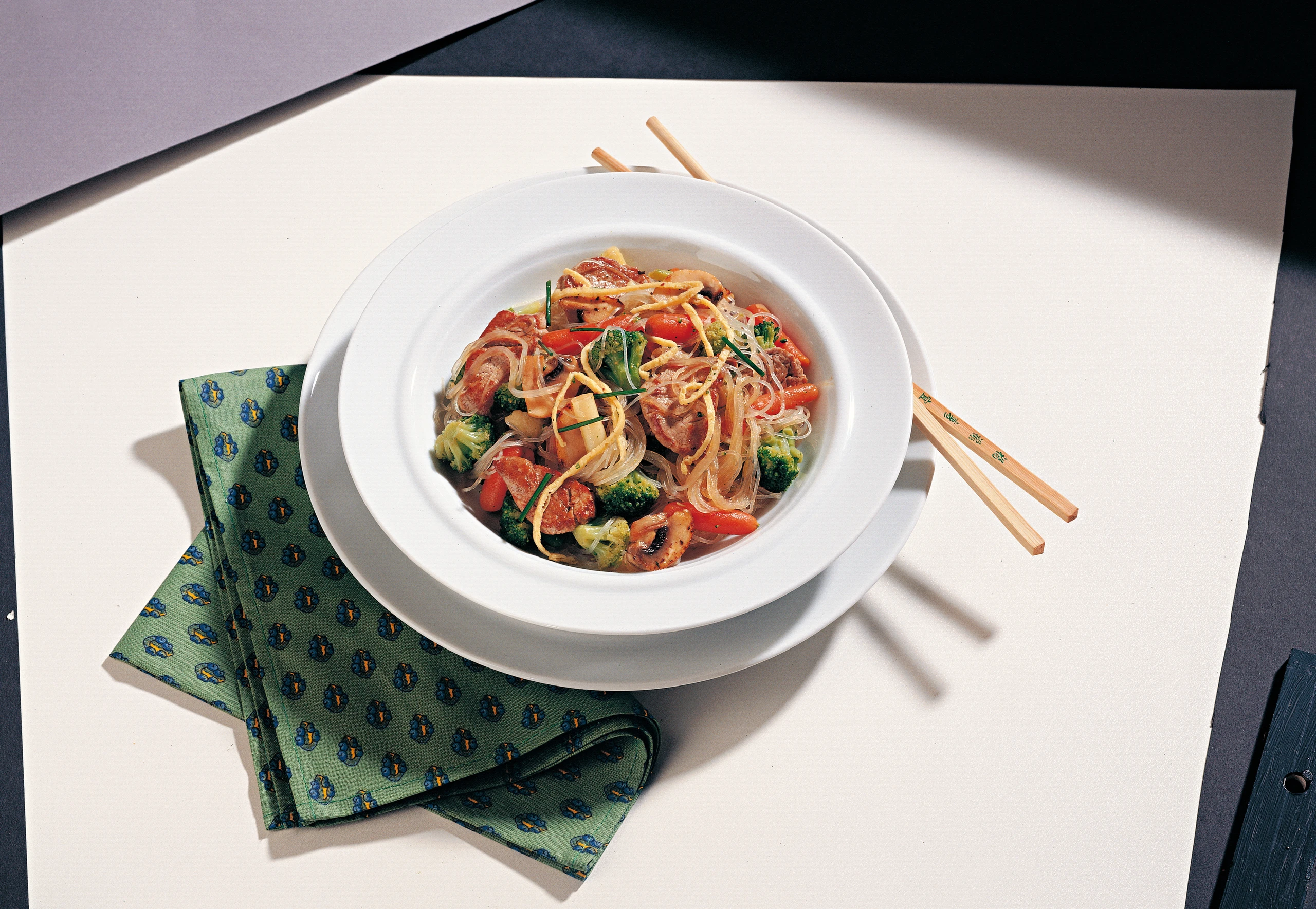 Ca. 2 l Salzwasser aufkochen, Nudeln zugeben und Topf vom Herd nehmen. Nudeln ca. 4 Minuten zugedeckt ziehen lassen, mit einer Gabel auflockern, auf ein Sieb schütten, mit kaltem Wasser abschrecken und gut abtropfen lassen.