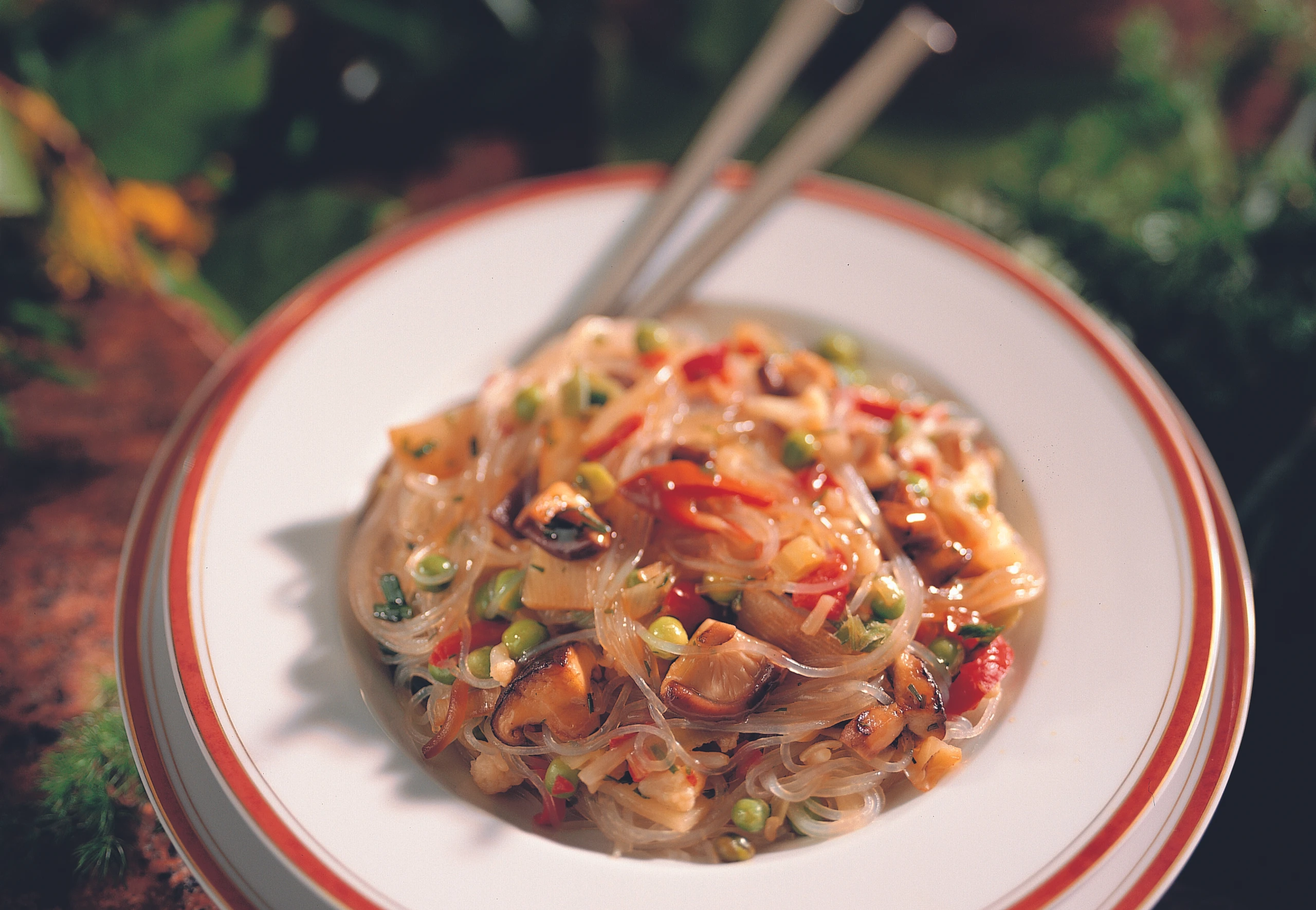 Sauce nochmals aufkochen. Pilze, Schnittlauch und Glasnudeln zugeben, behutsam durchmischen und erwärmen. Nudeln anrichten.