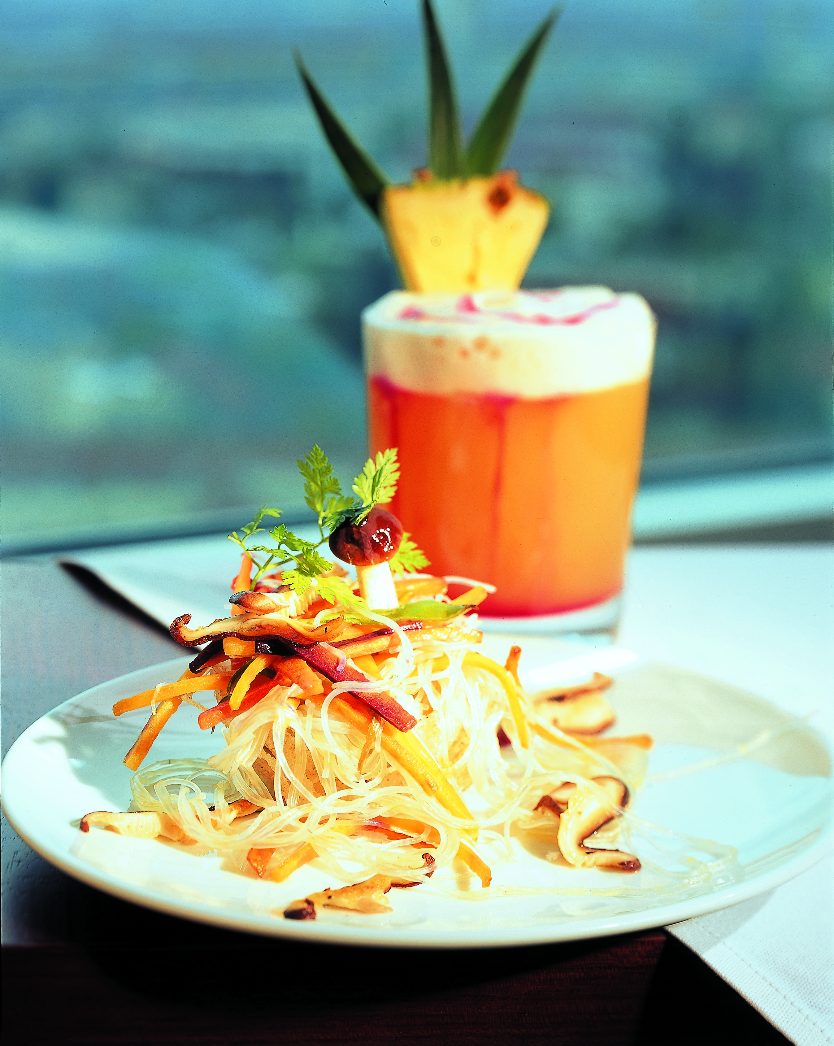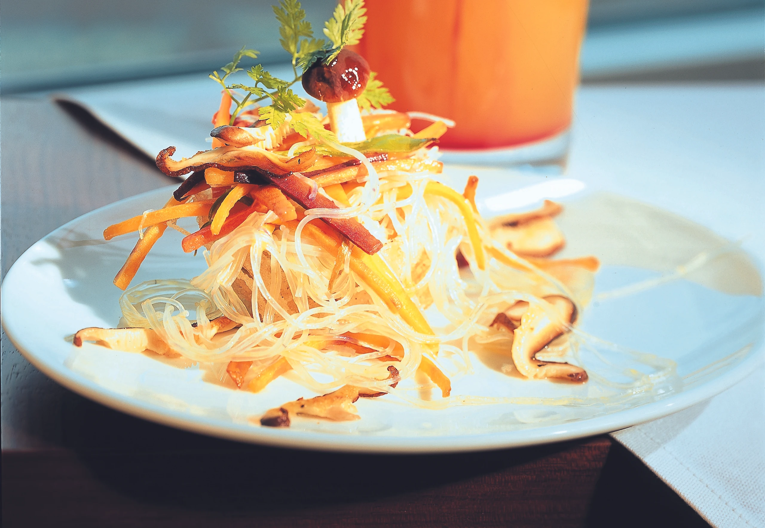 Nudeln in ca. 5 cm lange Stücke schneiden (Schere) und mit Sesamöl marinieren. Nudeln, Gemüse und Jungzwiebeln vermischen. Salat mit Sojasauce, Reiswein, Zitronensaft abschmecken und mit gebratenen Pilzen und Petersilie garniert servieren.