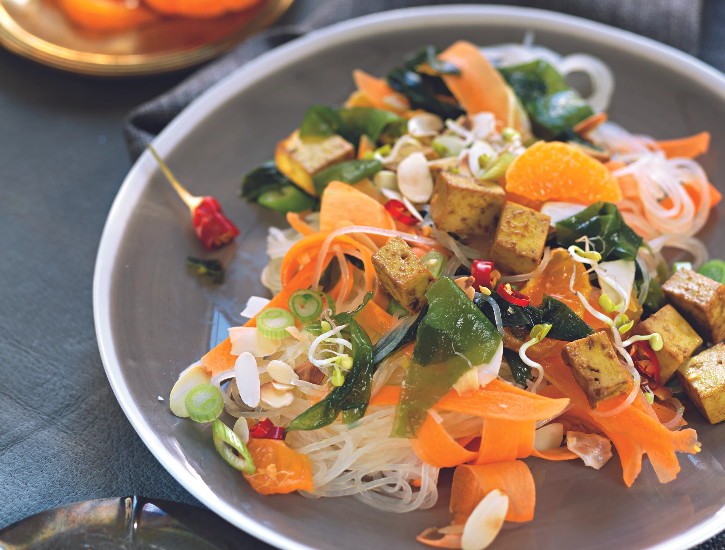 Für das Dressing alle Zutaten verrühren, mit Salz abschmecken. Glasnudeln, Wakame, Gemüse und Mandarinen mit dem Dressing vermischen.