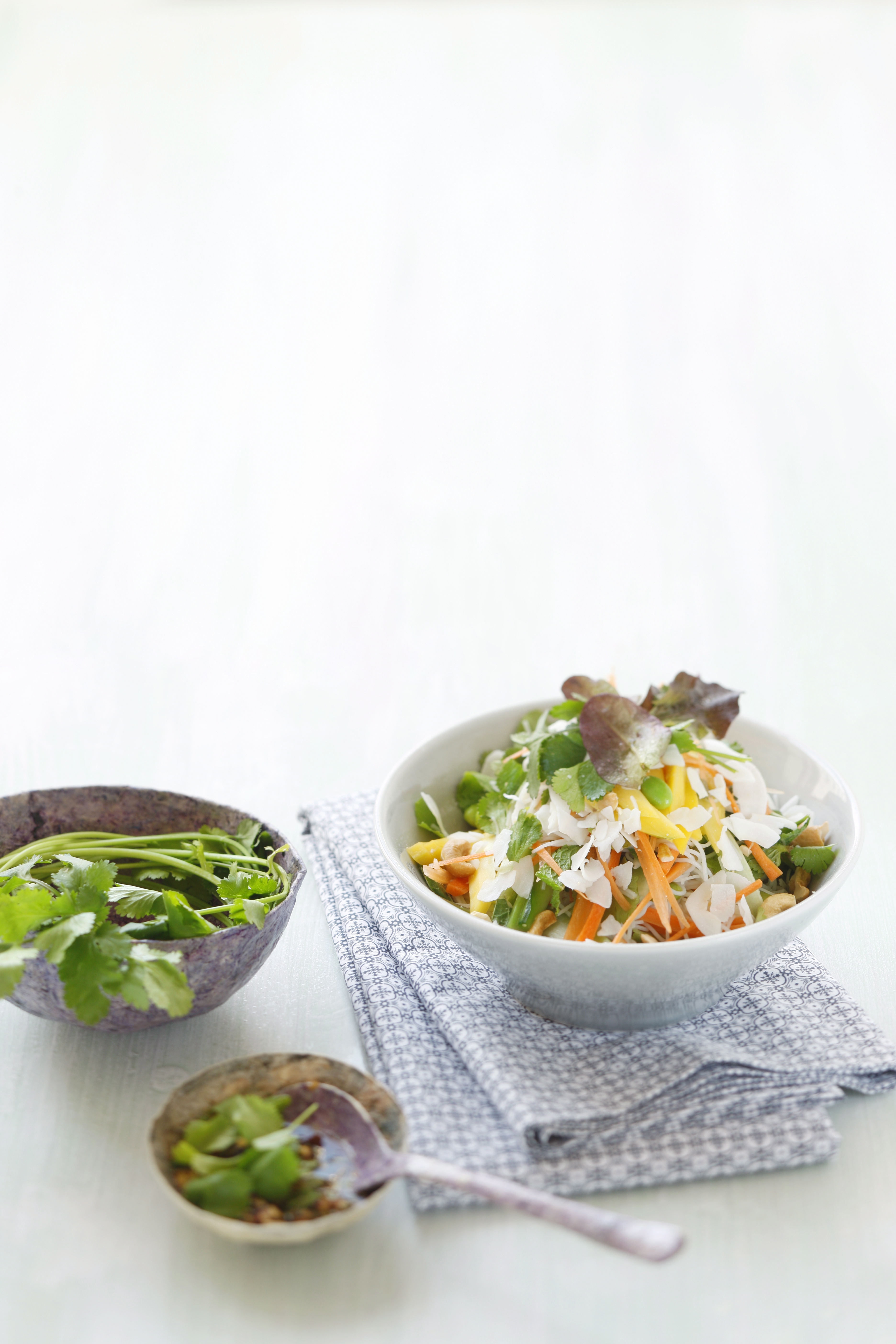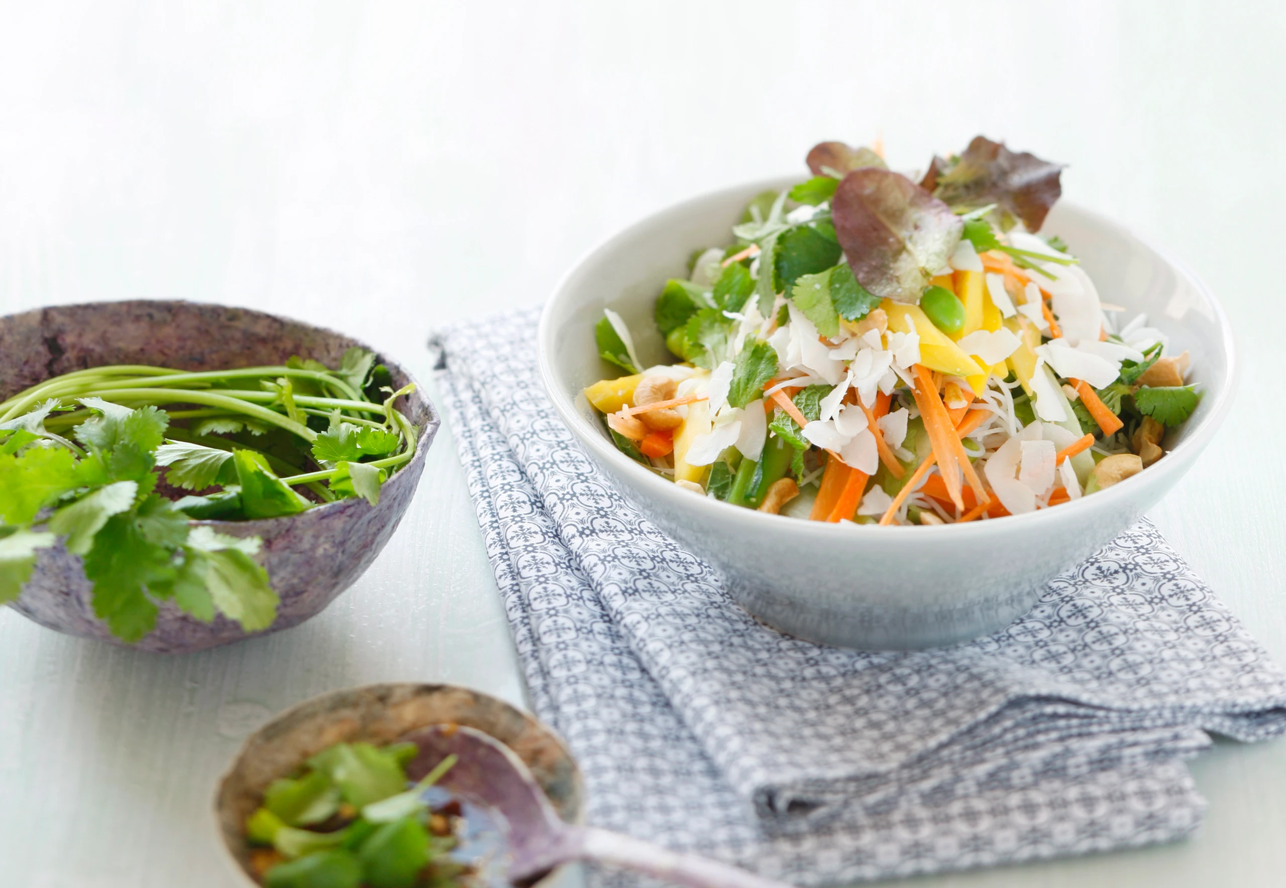 Glasnudeln mit Bohnen, Gurke, Mango, Cashews, Karotten und der Marinade vermischen. Salat anrichten, mit den Kräutern bestreuen und evtl. mit Salatblättern und Kokosflocken garnieren.