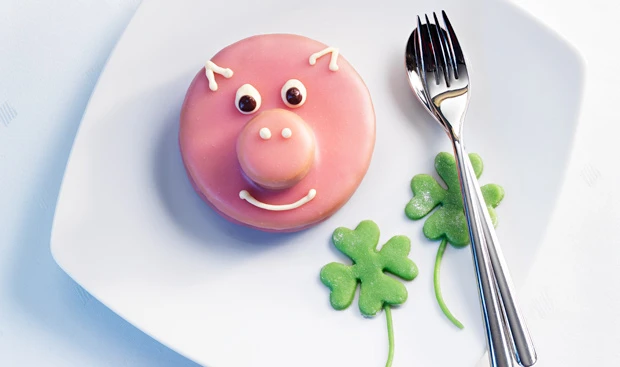 Marzipan dünn ausrollen, Kleeblätter ausstechen, Stiele ausschneiden, beides zusammensetzen. Schweinchen mit den Kleeblättern servieren.