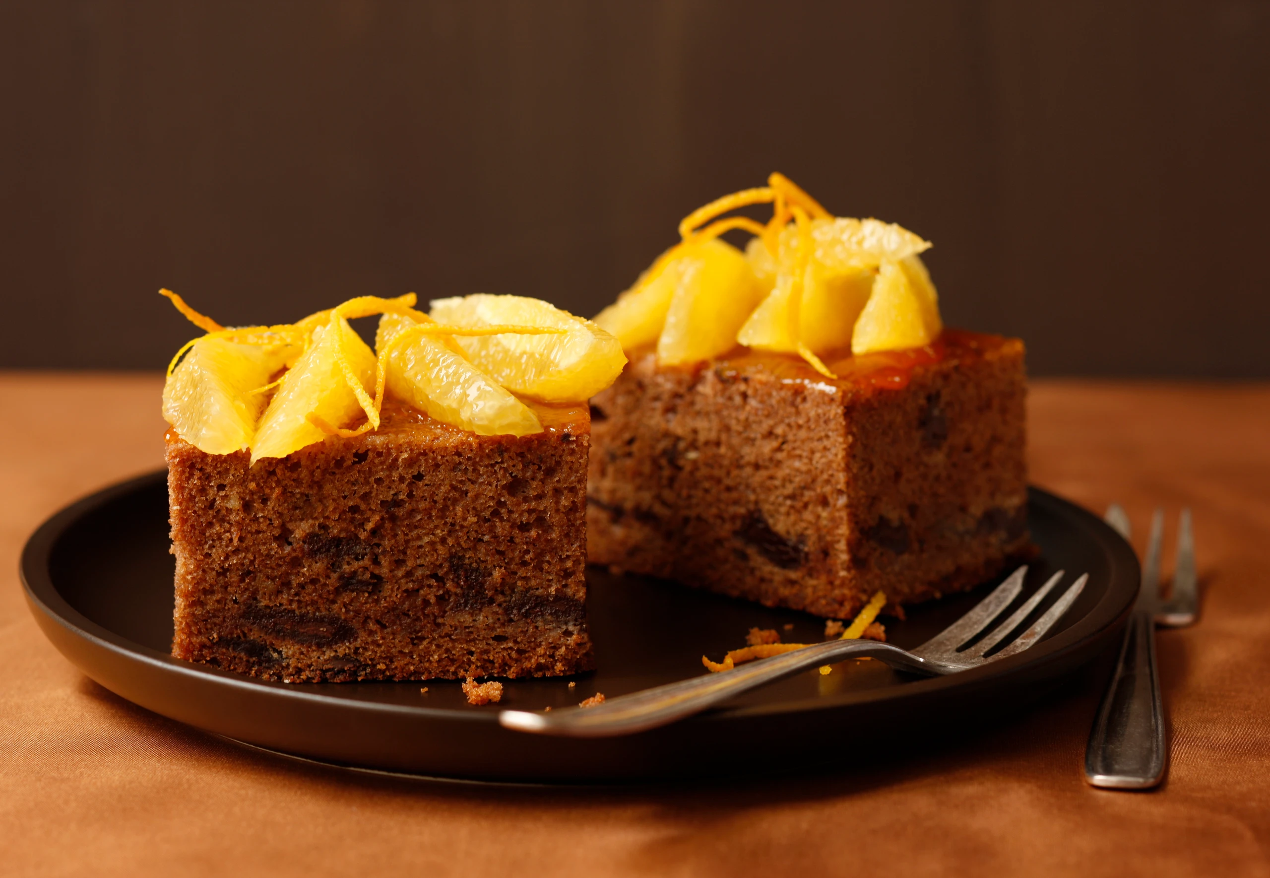 Für die Garnitur Schale von 2 Orangen in Zesten abheben. Alle Orangen so schälen, dass auch die weiße Innenhaut entfernt wird. Filets zwischen den Trennhäuten herausschneiden. Marmelade glatt rühren, Schnitte damit bestreichen, mit Orangenfilets und -zesten garnieren.