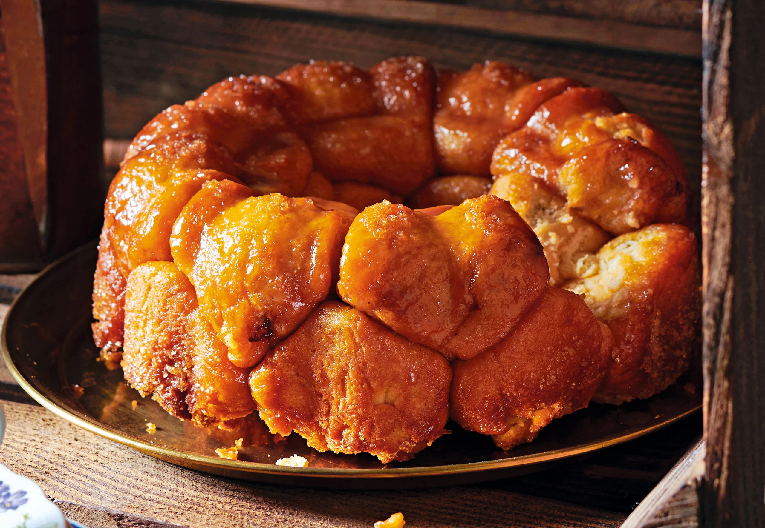 Teig auf einer leicht bemehlten Arbeitsfläche rechteckig ausrollen und in 25 Stücke schneiden. Jedes Stück mit 1 TL Powidl füllen. Ränder vorsichtig zusammendrücken. Buchteln in die zerlassene Butter tunken, dann in den braunen Zucker. Buchteln in die Gugelhupfform schichten. Mit einem feuchten Tuch abdecken und an einem warmen Ort ca. 1 Stunde gehen lassen.