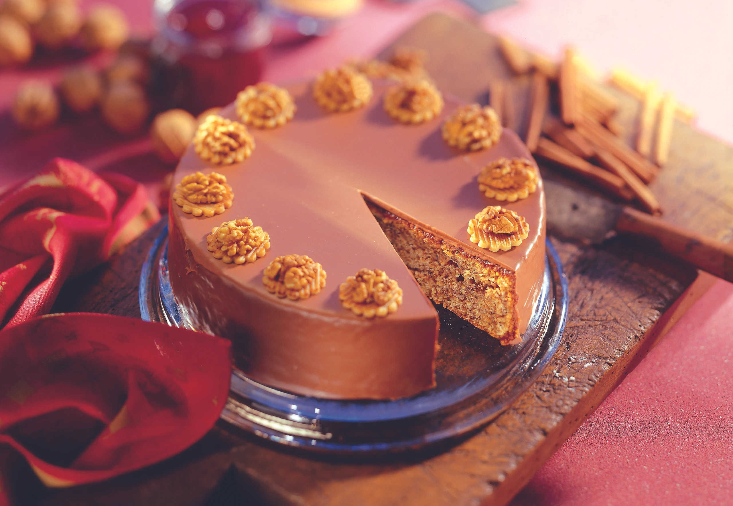 Für die Garnitur Marzipan mit Zucker und Kakao verkneten und auf einer leicht mit Staubzucker bestreuten Arbeitsfläche ca. 3 mm dick ausrollen. Mit einem gezackten Ausstecher (Ø 3 cm) 12 Scheiben ausstechen, Scheiben mit einem Streifenmuster verzieren, dafür mit einem Messerrücken in kurzen Abständen Rillen eindrücken. Auf jede Marzipanscheibe einen Tupfer Glasur geben, die Nusskerne darauf setzen und die Schokolade fest werden lassen. Torte mit den Marzipan-Nussscheiben belegen.