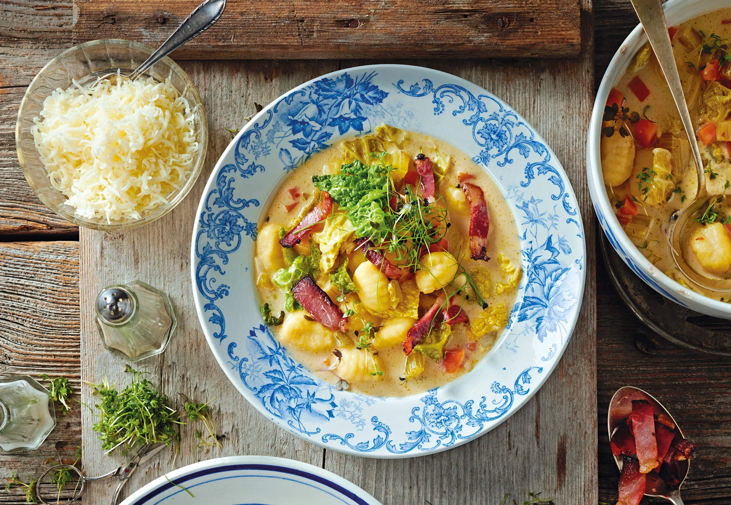 Obers zugießen. Kohl in Stücke schneiden und mit den Gnocchi zugeben. 10 Minuten köcheln.