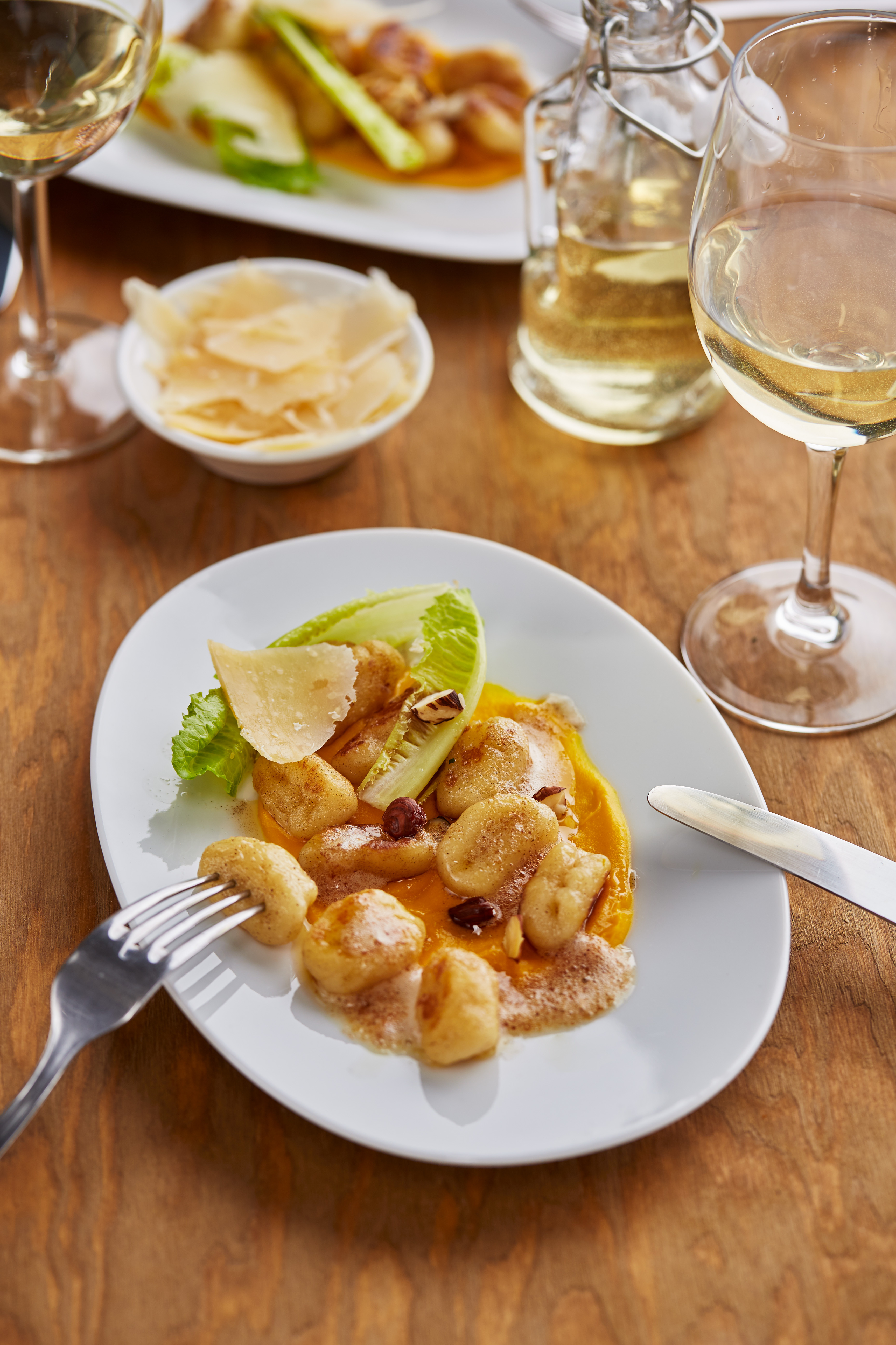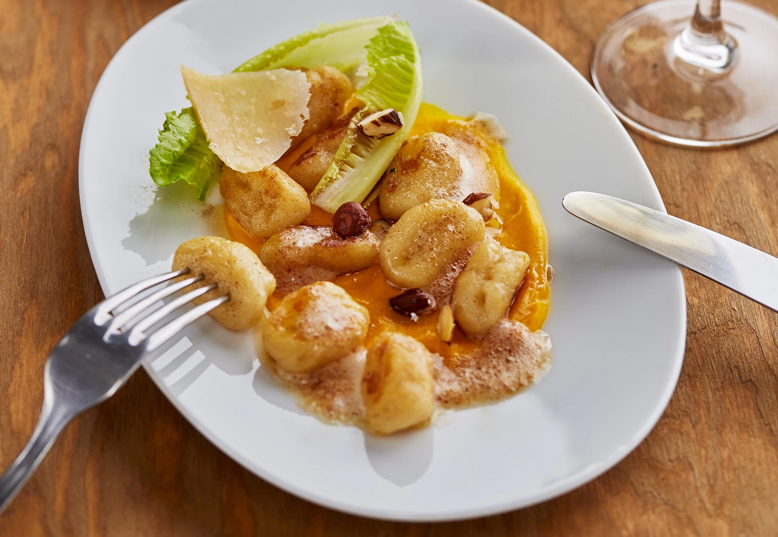 Gnocchi mit dem Kürbissauce anrichten und mit Nüssen, Salat und Parmesan garniert servieren.