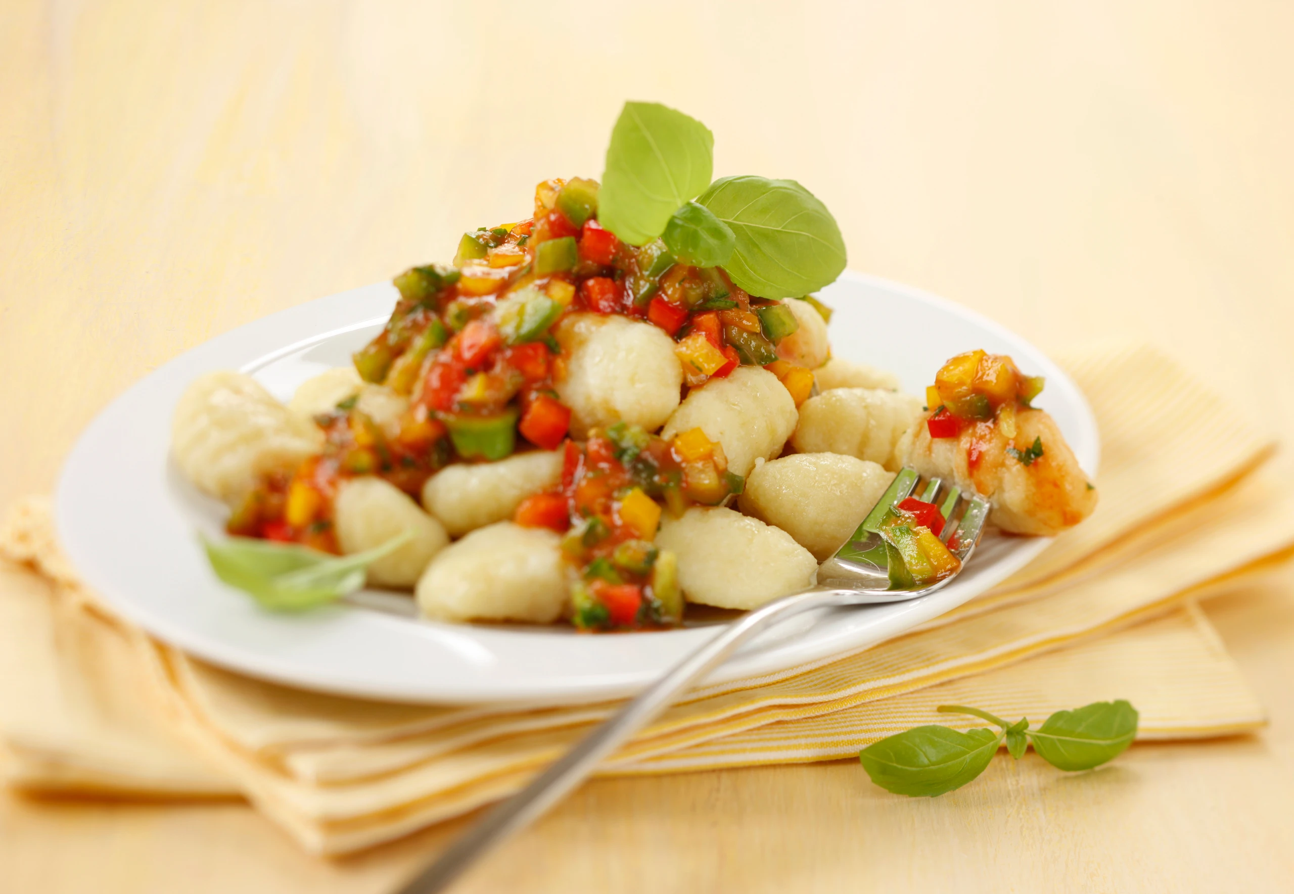 - Gnocchi laut Packungsanleitung zubereiten, abtropfen lassen und in 2 EL heißem Olivenöl schwenken. Gnocchi mit der Sauce anrichten.