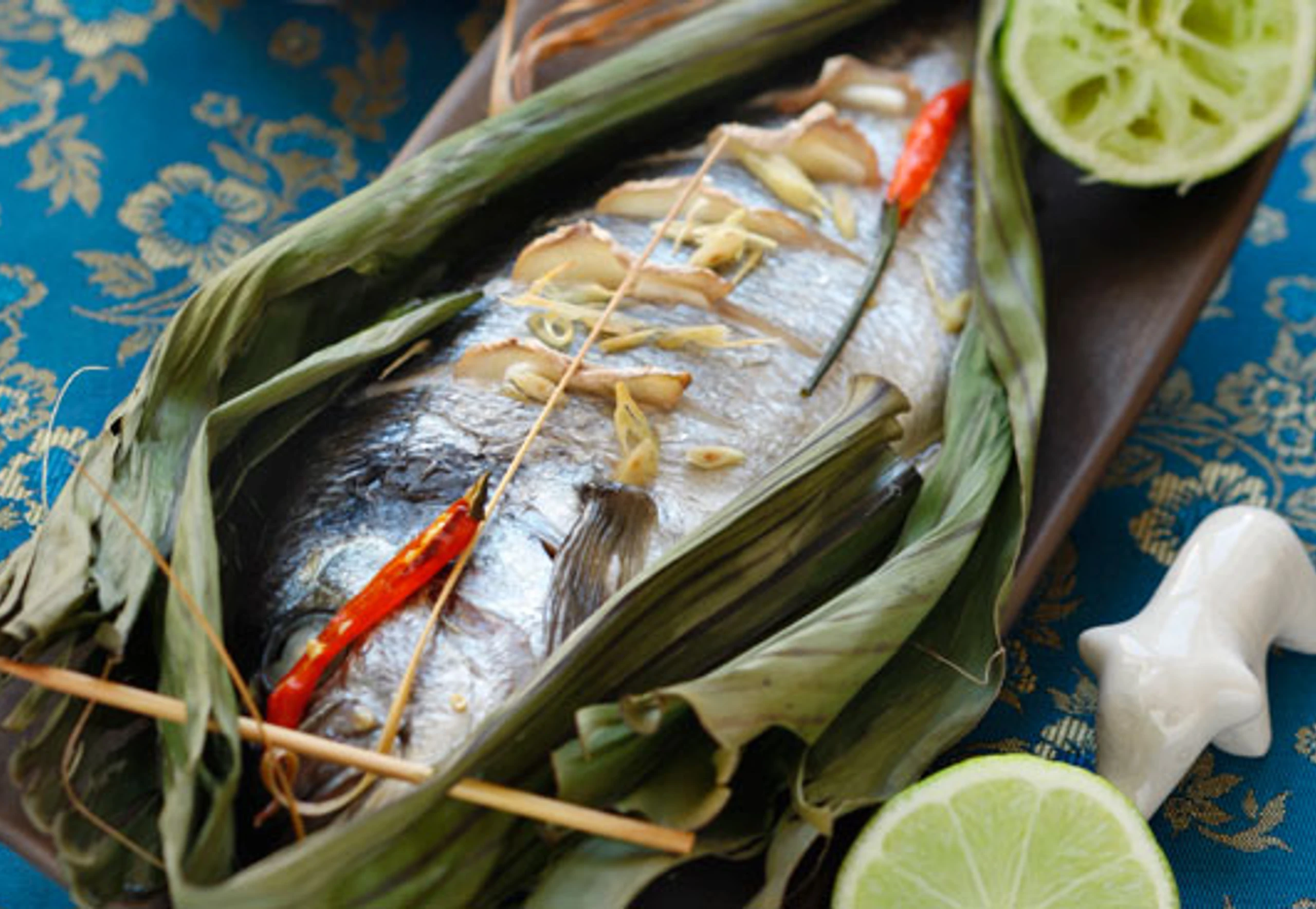 - Fische auf die Bananenblätter legen, mit Öl beträufeln und mit Chilis belegen. Bananenblätter zu einem "Boot" formen, mit Holzspießen feststecken. Fische auf ein Backblech legen und im Rohr (mittlere Schiene) ca. 25 Minuten garen.