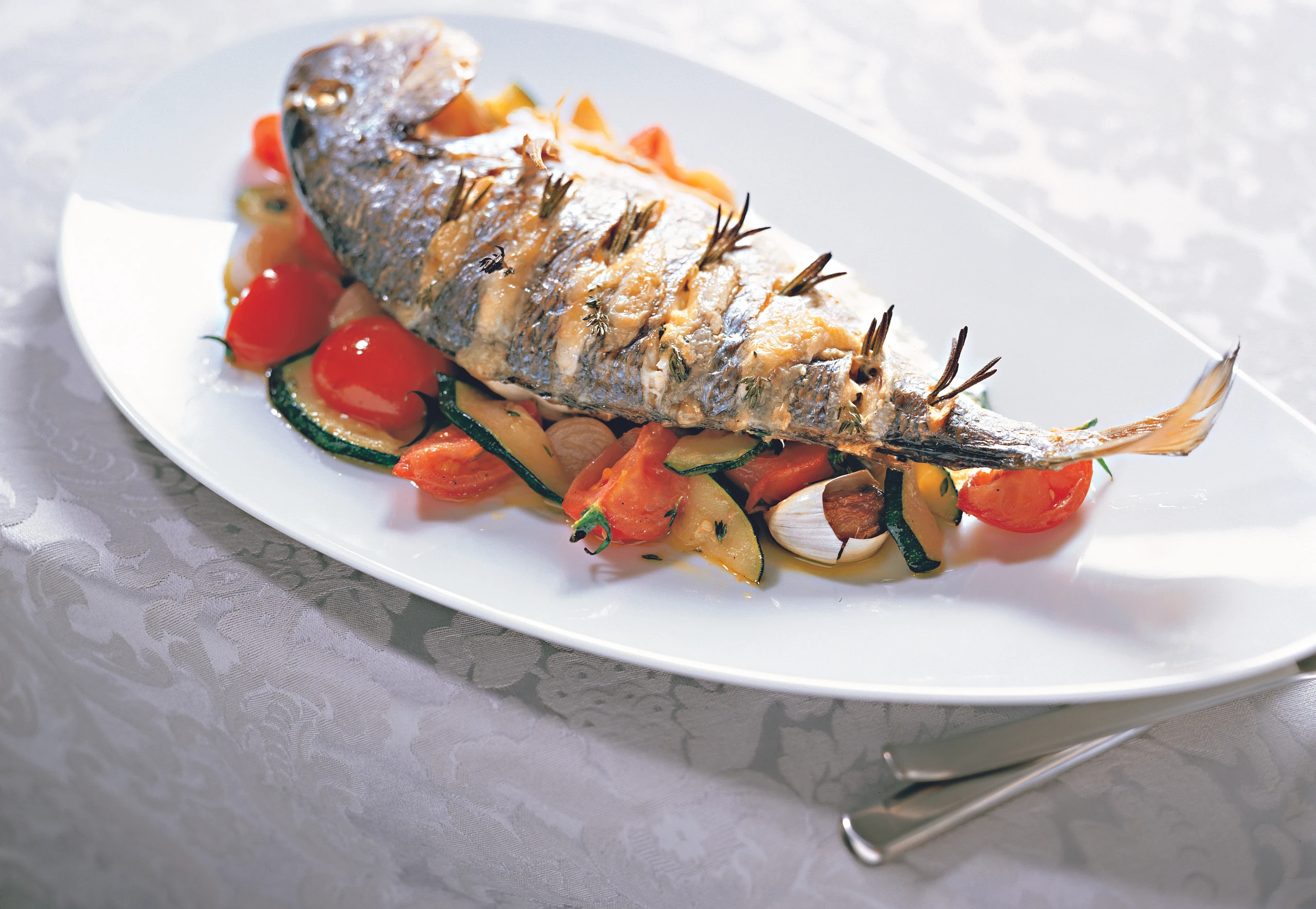 Fische auf dem Gemüse anrichten und mit frischen Kräutern garnieren.