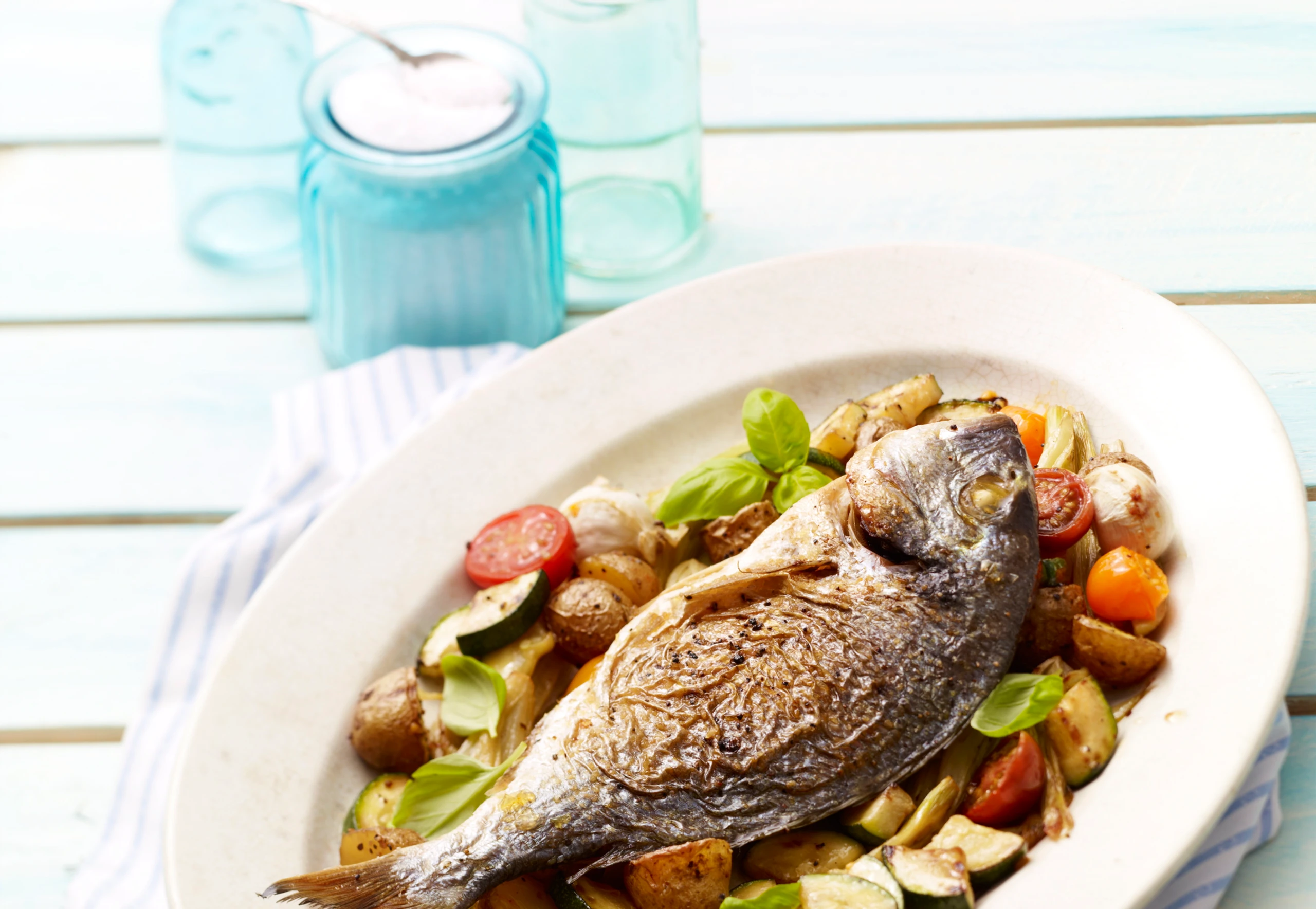 - Zucchini und Fenchel putzen. Erdäpfel mit einer Gemüsebürste abreiben und halbieren. Zucchini längs vierteln und in Scheiben schneiden. Fenchel in Streifen schneiden, Paradeiser halbieren, restlichen Knoblauch mit dem Messer andrücken. Gemüse auf das Blech legen, salzen, pfeffern und mit wenig Olivenöl beträufeln. Fische und Gemüse im Rohr (mittlere Schiene) ca. 30 Minuten garen.