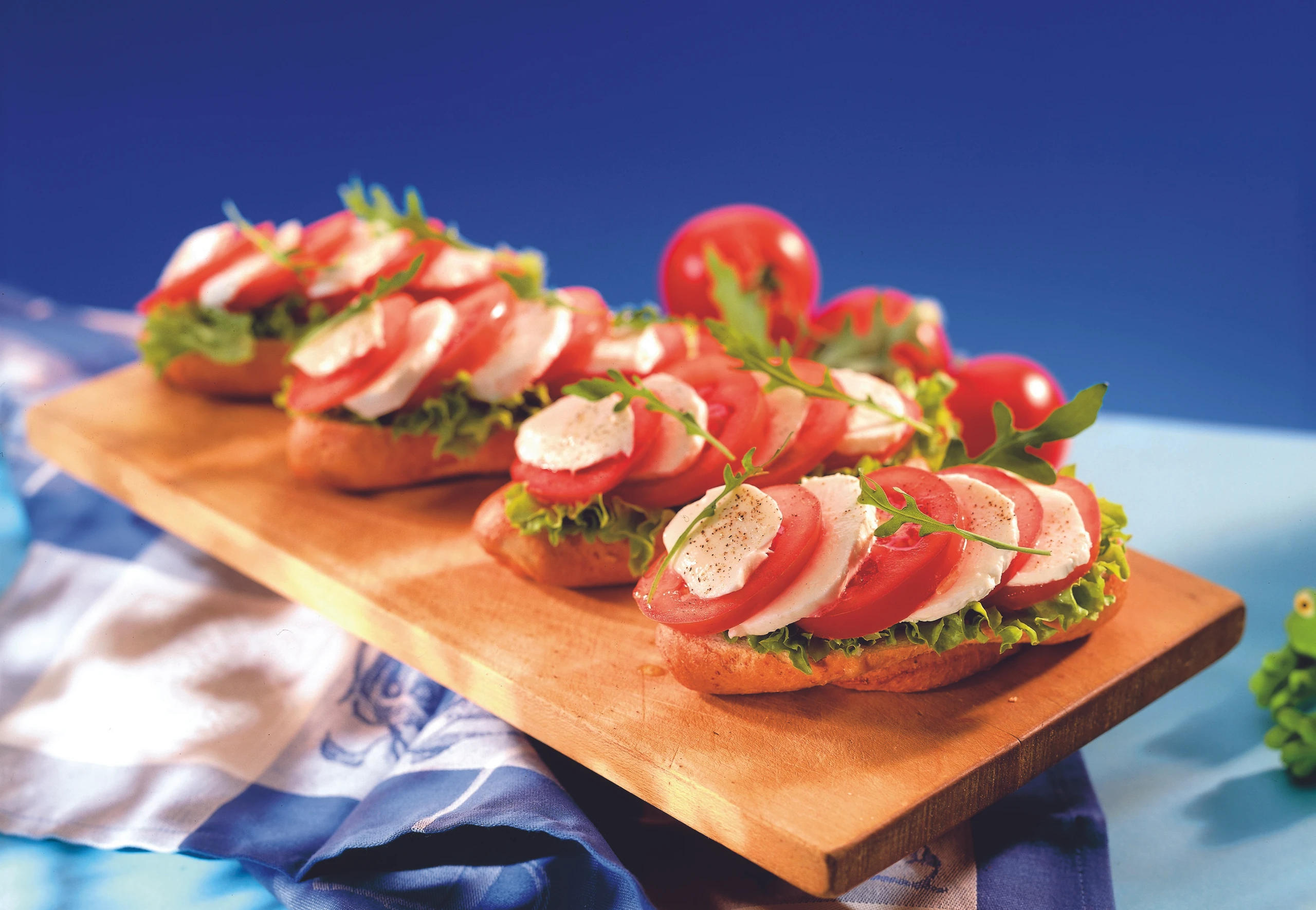 Weckerln der Länge nach durchschneiden. Die Hälften zuerst mit Salatblättern, dann mit Paradeiser- und Mozzarellascheiben belegen. Weckerln salzen, pfeffern und mit Rucolablättern garnieren.
