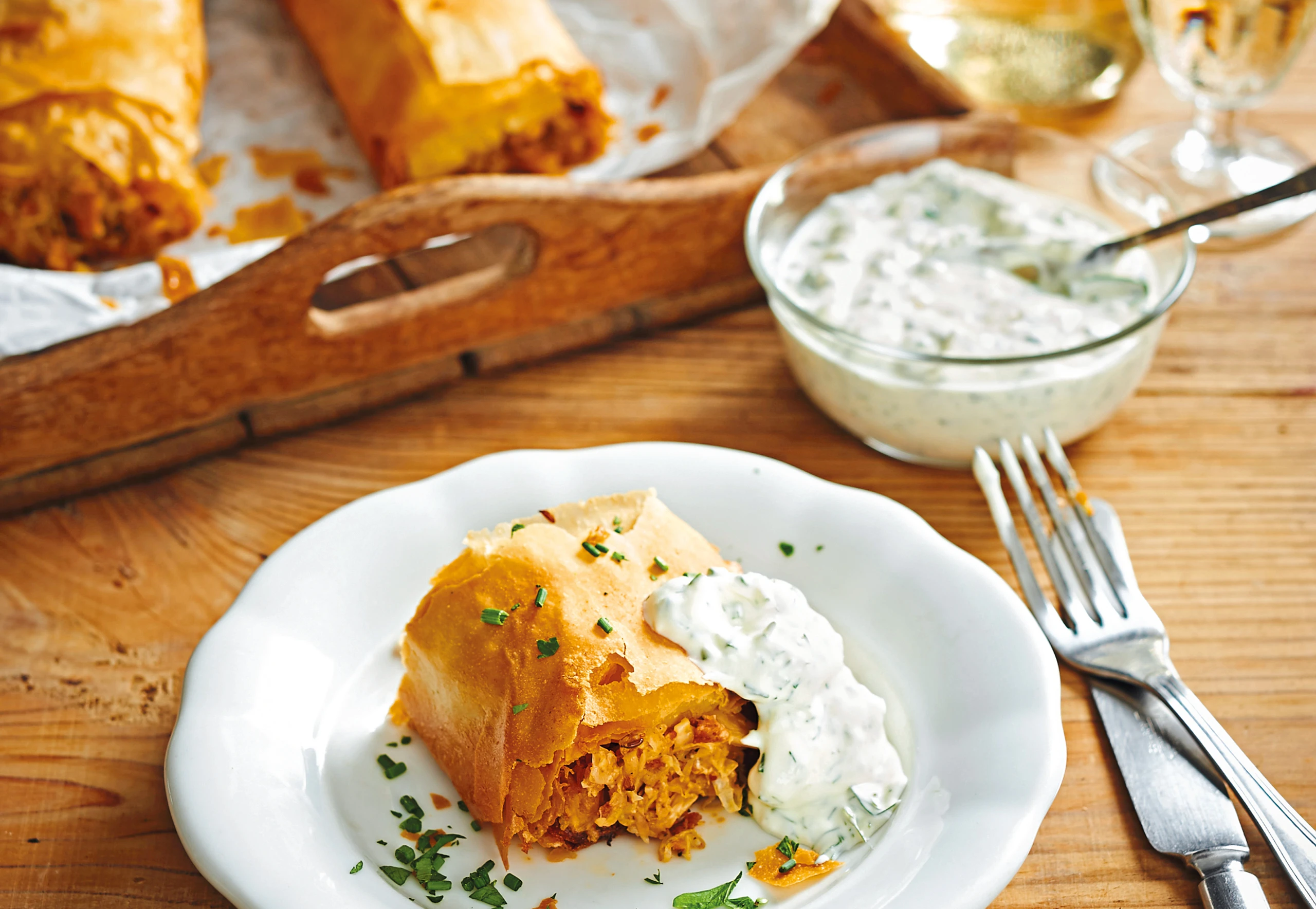 Grammel-Kraut-Strudel mit Kräuter-Dip